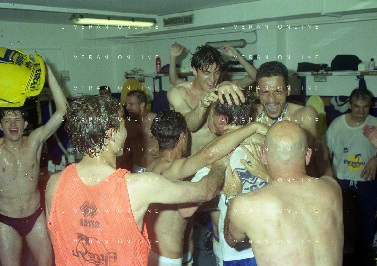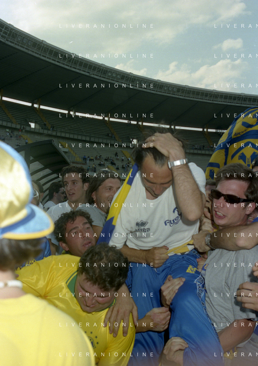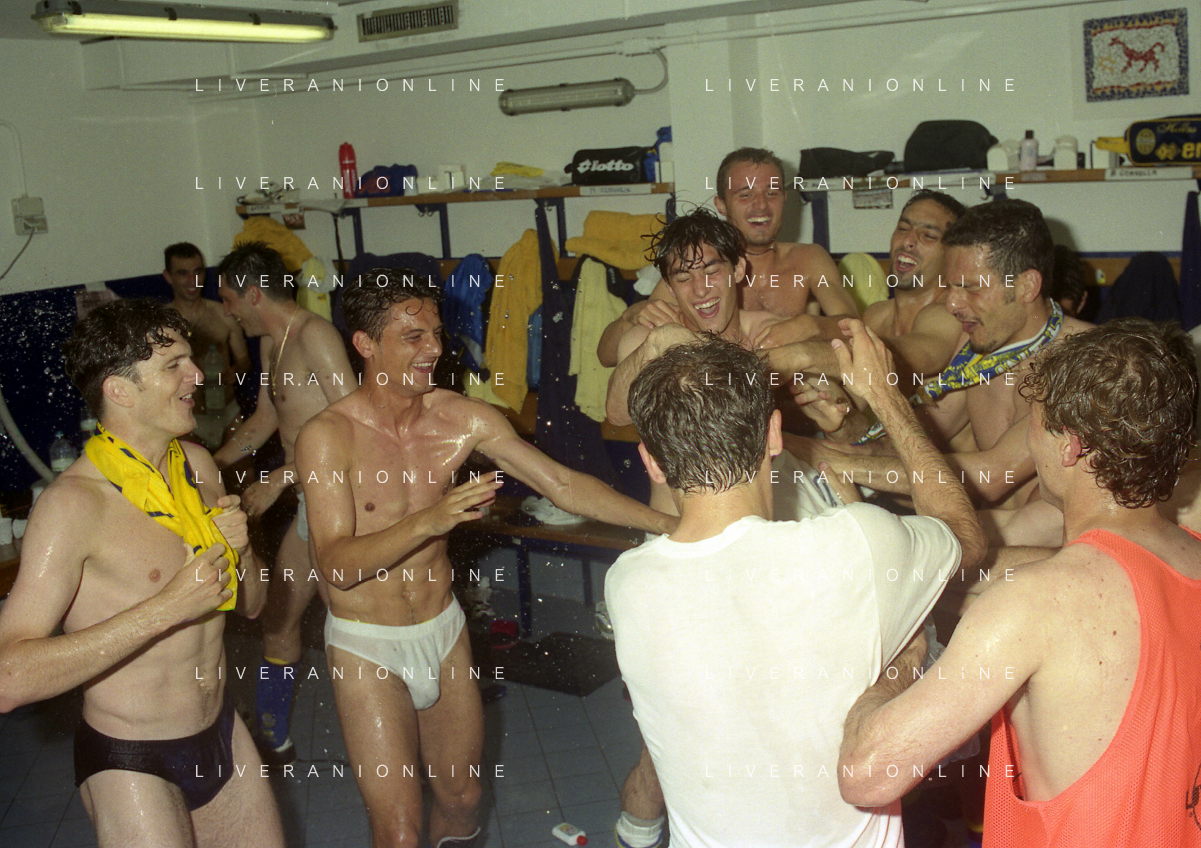 06-06-1999 CAMPIONATO DI CALCIO SERIE B VERONA -NAPOLI NELLA FOTO I GIOCATORI DEL VERONA FESTEGGIANO LA PROMOZIONE IN SERIE A AG ALDO LIVERANI SAS
