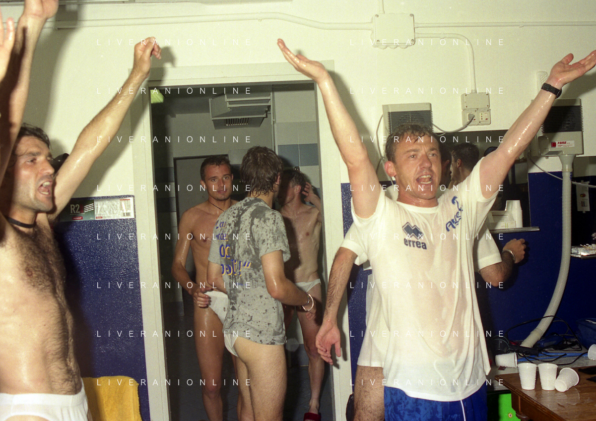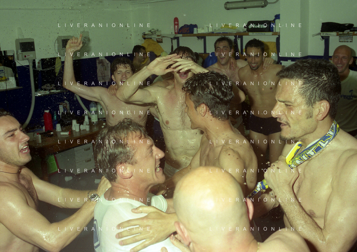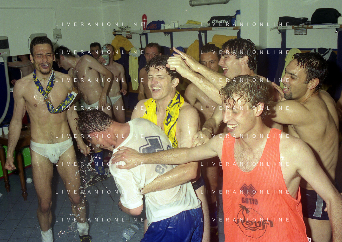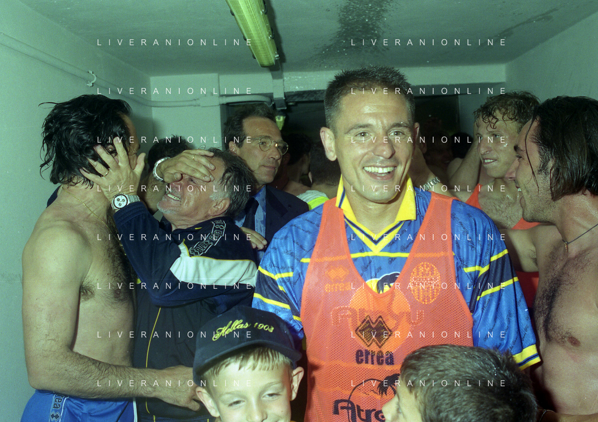 06-06-1999 CAMPIONATO DI CALCIO SERIE B VERONA -NAPOLI NELLA FOTO I GIOCATORI DEL VERONA FESTEGGIANO LA PROMOZIONE IN SERIE A AG ALDO LIVERANI SAS