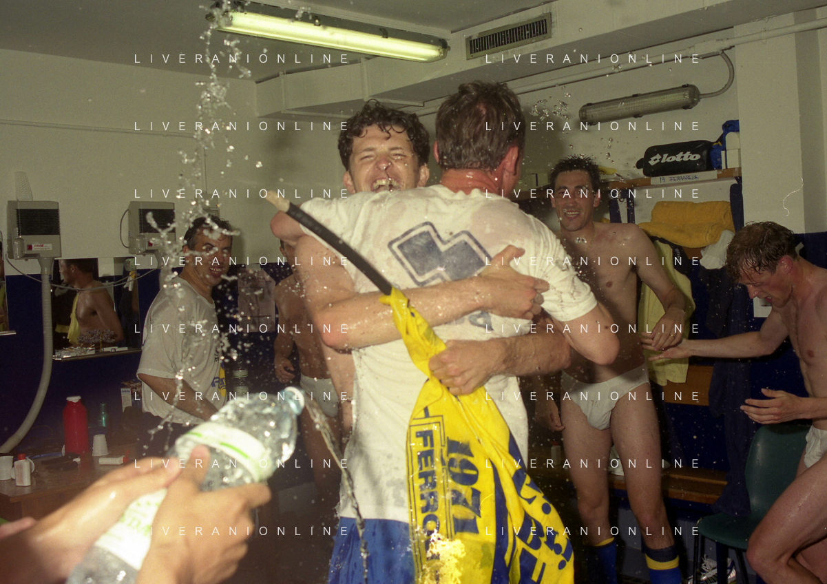 06-06-1999 CAMPIONATO DI CALCIO SERIE B VERONA -NAPOLI NELLA FOTO I GIOCATORI DEL VERONA FESTEGGIANO LA PROMOZIONE IN SERIE A AGLIETTI E FILIPPINI AG ALDO LIVERANI SAS