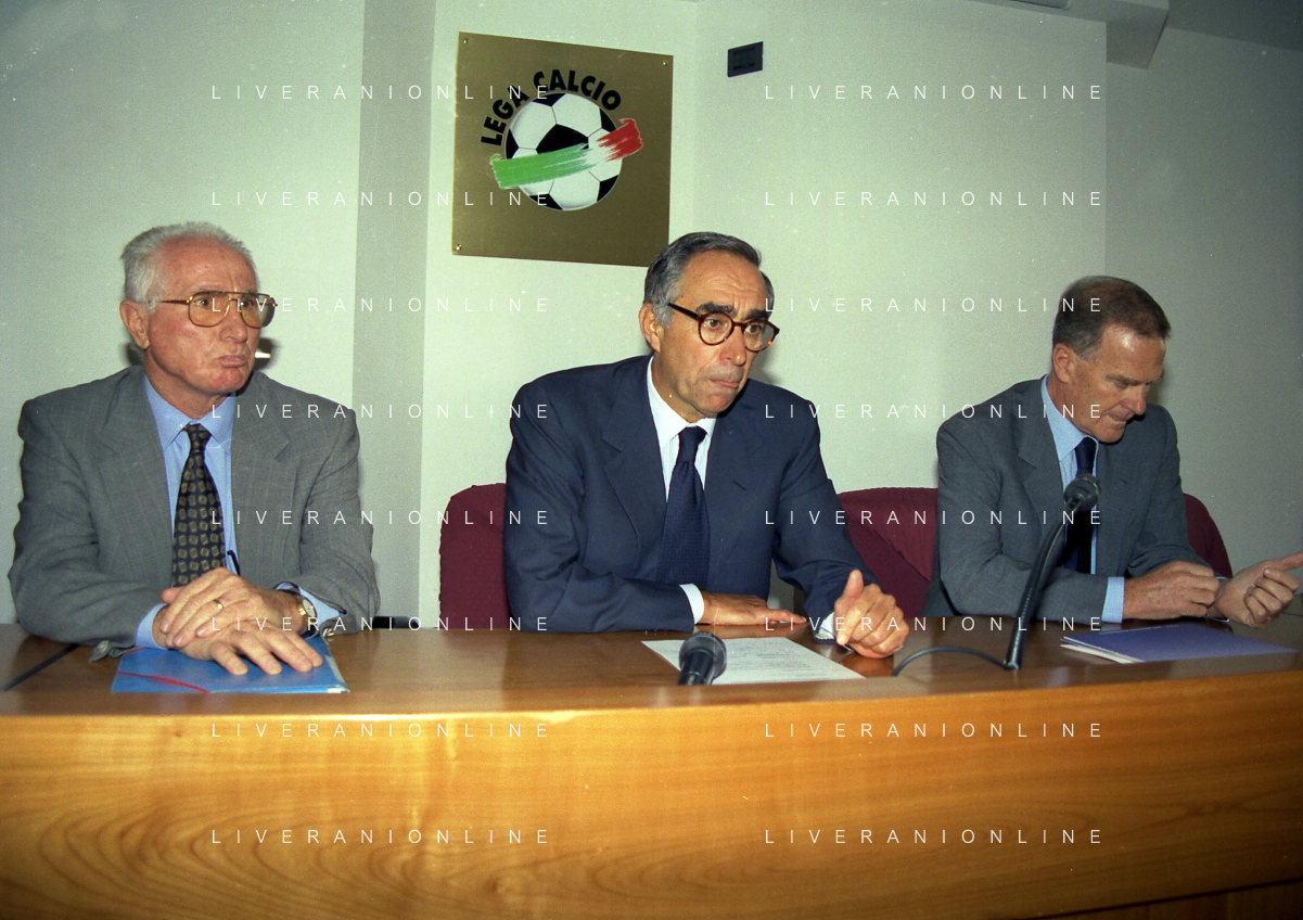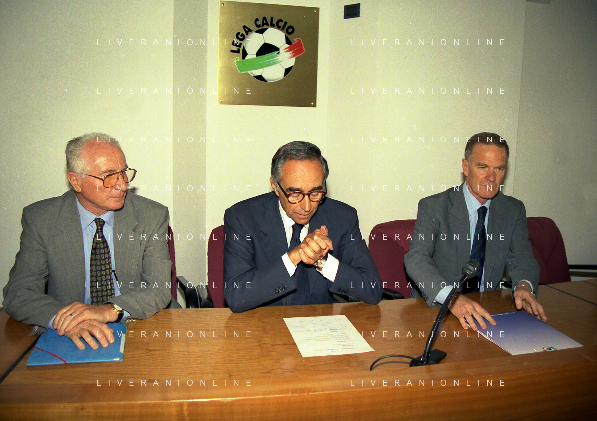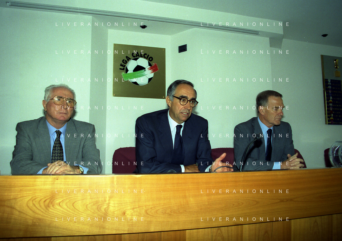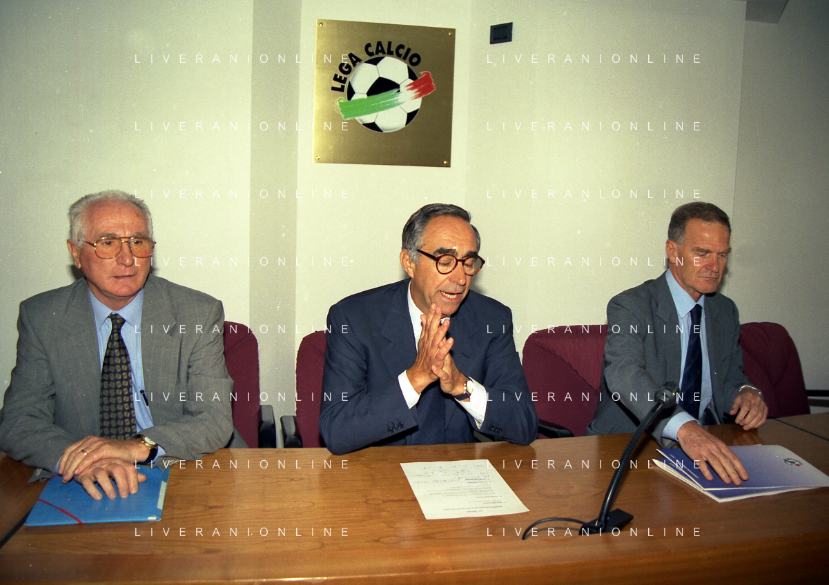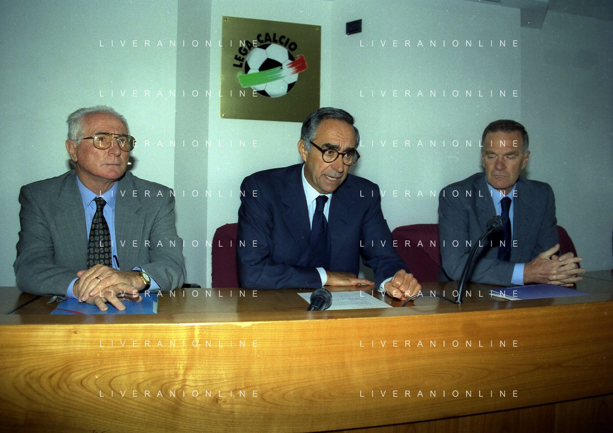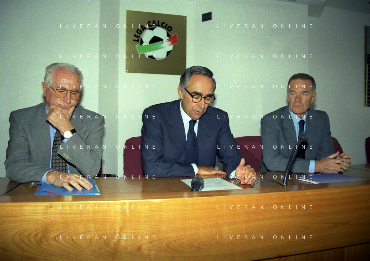 MILANO 29-09-1997 SEDE DELLA LEGA CALCIO IN VIA ROSSELLINI CONFERENZA STAMPA TRA LEGA CALCIO E AIC NELLA FOTO AZEGLIO VICINI FRANCO CARRARO E SERGIO CAMPANA AG ALDO LIVERANI SAS