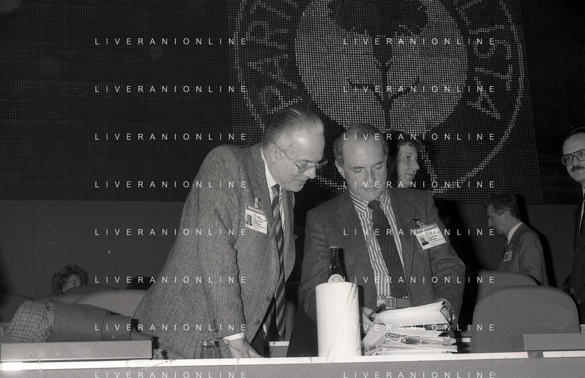 NEG-RETROSPETTIVA LELIO LAGORIO POLITICO NELLA FOTO LELIO LAGORIO CON ENRICO MANCA AL CONGRESSO DEL PARTITO SOCIALISTA ITALIANO A RIMINI NELL'ANNO 1987 AG ALDO LIVERANI SAS