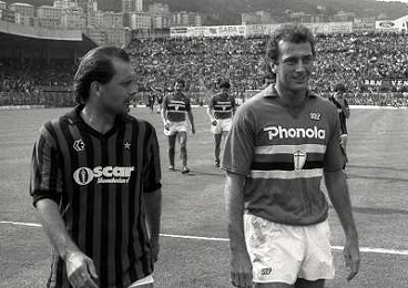 14-04-1985 GENOVA-CAMPIONATO DI CALCIO SERIE A SAMPDORIA MILAN 2-1 NELLA FOTO PIETRO PAOLO VIRDIS E LUCA PELLEGRINI AG ALDO LIVERANI SAS