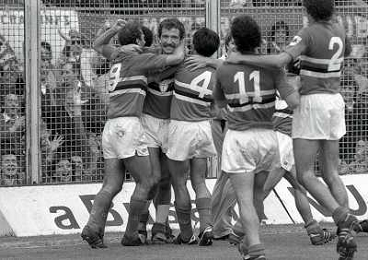 14-04-1985 GENOVA-CAMPIONATO DI CALCIO SERIE A SAMPDORIA MILAN 2-1 NELLA FOTO ABBRACCI GIOCATORI SAMPDORIA AG ALDO LIVERANI SAS