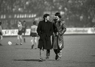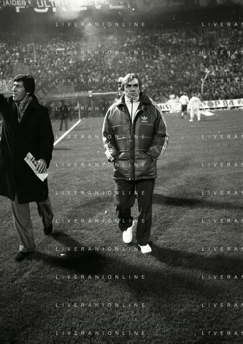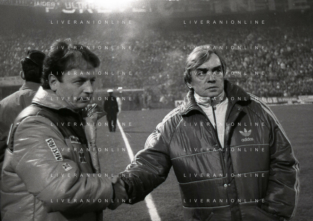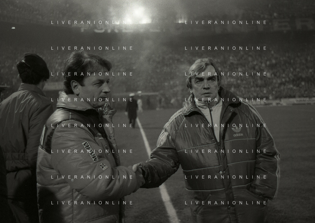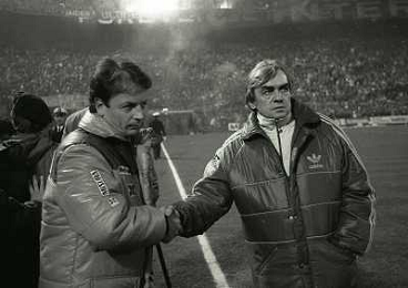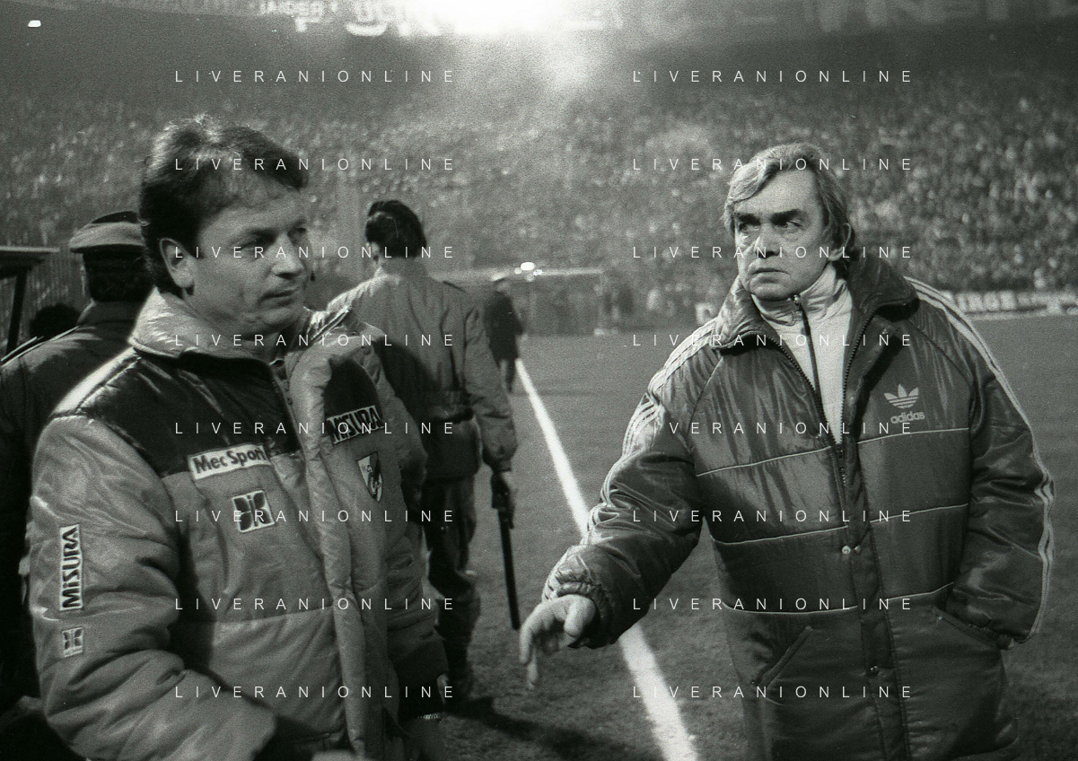 12-12-1984 MILANO- OTTAVI DI COPPA UEFA INTER AMBURGO 1-0 NELLA FOTO ERNEST HAPPEL ALLENATORE AMBURGO CON ILARIO CASTAGNER ALLENATORE INTER AG ALDO LIVERANI SAS