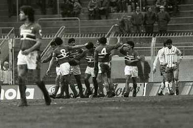 02-03-1986 GENOVA-CAMPIONATO DI CALCIO SERIE A SAMPDORIA PISA 3-0 NELLA FOTO ABBRACCI GIOCATORI SAMPDORIA AG ALDO LIVERANI SAS