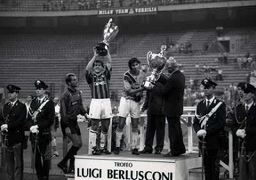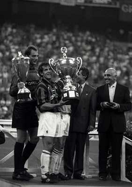 17-08-1994 MILANO TROFEO BERLUSCONI MILAN BAYERN MONACO 1-0 NELLA FOTO ADRIANO GALLIANI PREMIA FILIPPO GALLI E ROBERTO DONADONI AG ALDO LIVERANI SAS