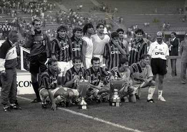 17-08-1994 MILANO TROFEO BERLUSCONI MILAN BAYERN MONACO 1-0 NELLA FOTO ROBERTO DONADONI CON FILIPPO GALLI E ADRIANO GALLIANI AG ALDO LIVERANI SAS
