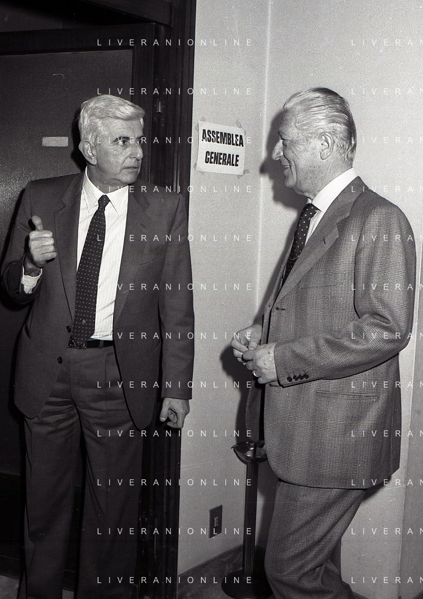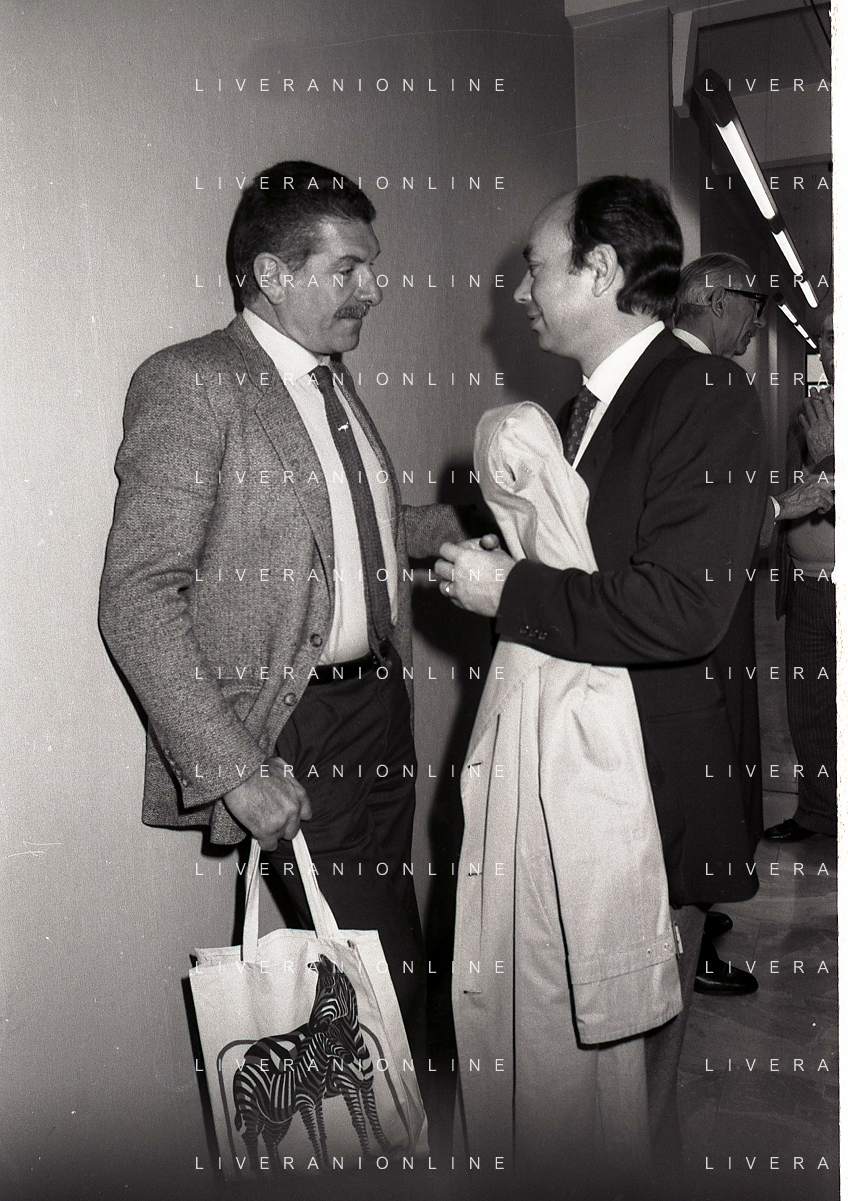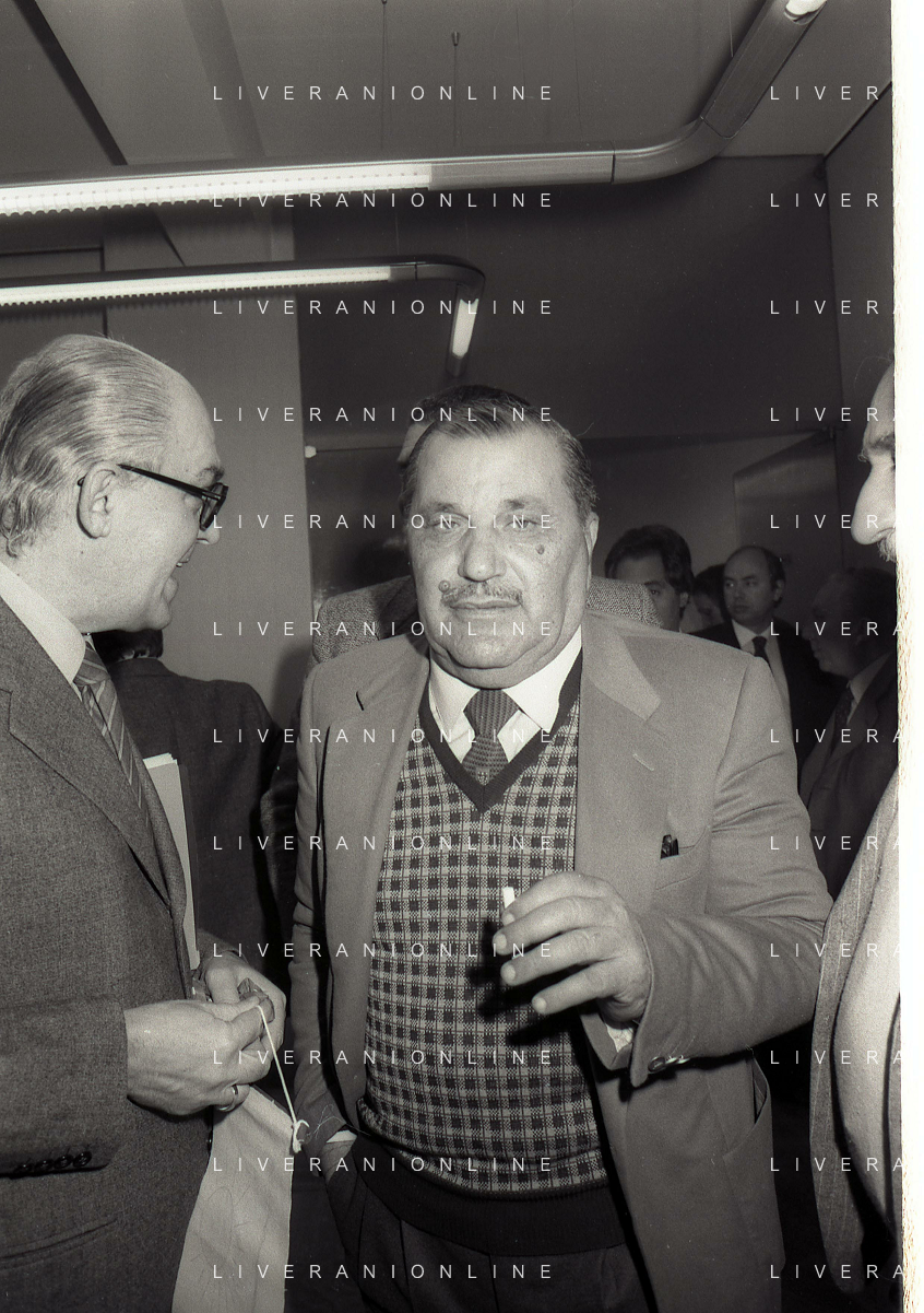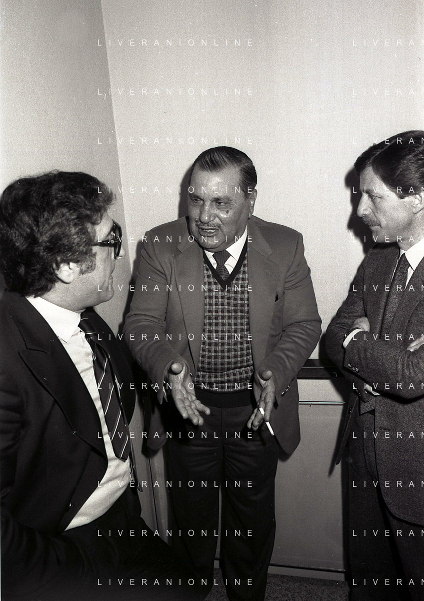 1983 MILANO VIA FILIPPETTI RIUNIONE DEI PRESIDENTI IN LEGA CALCIO NELLA FOTO FRANCO D'ATTOMA PRESIDENTE PERUGIA CALCIO CON IVANOE FRAIZZOLI AG ALDO LIVERANI SAS