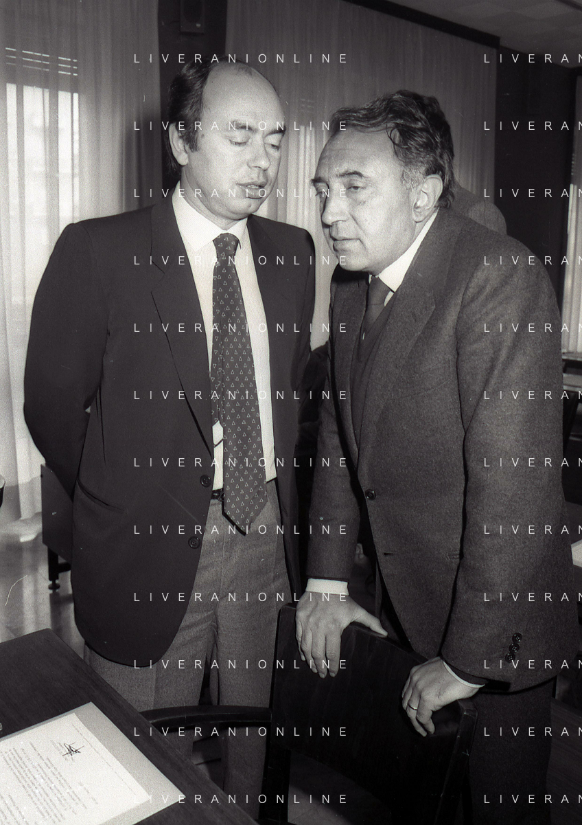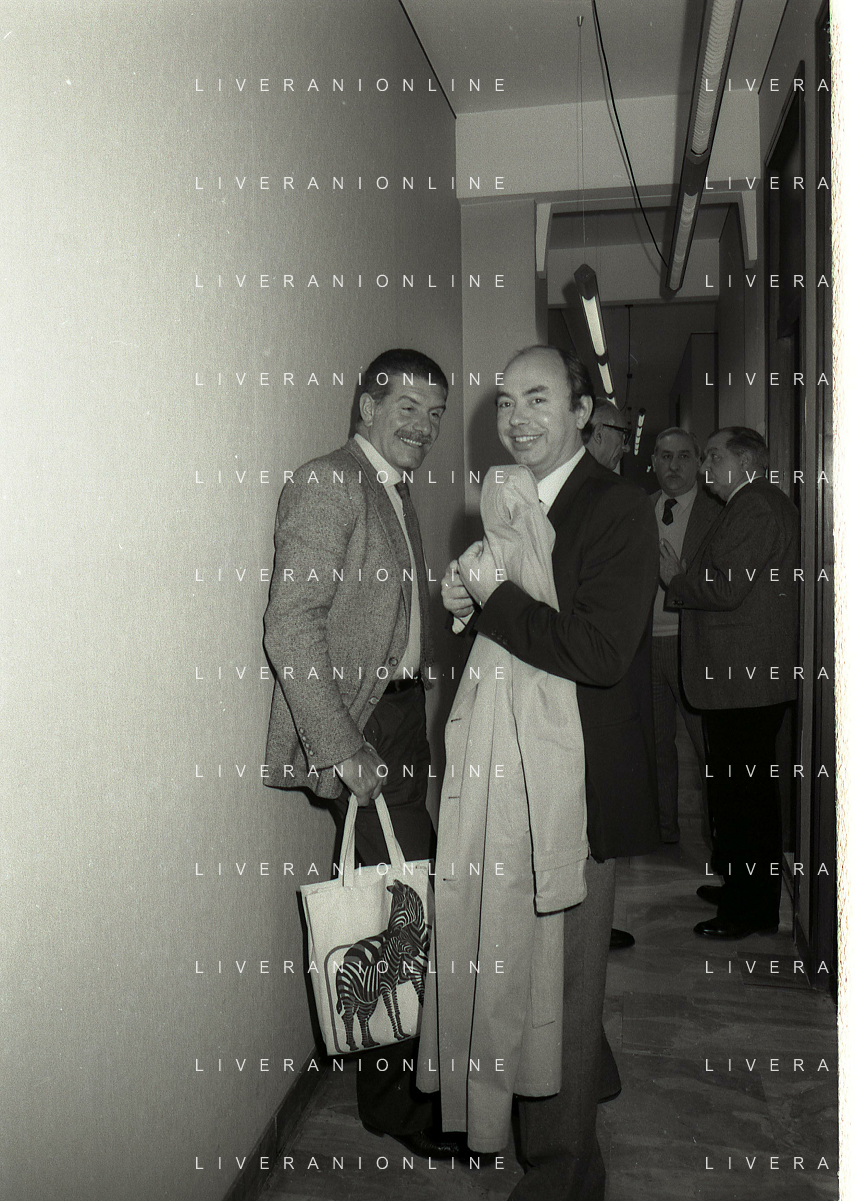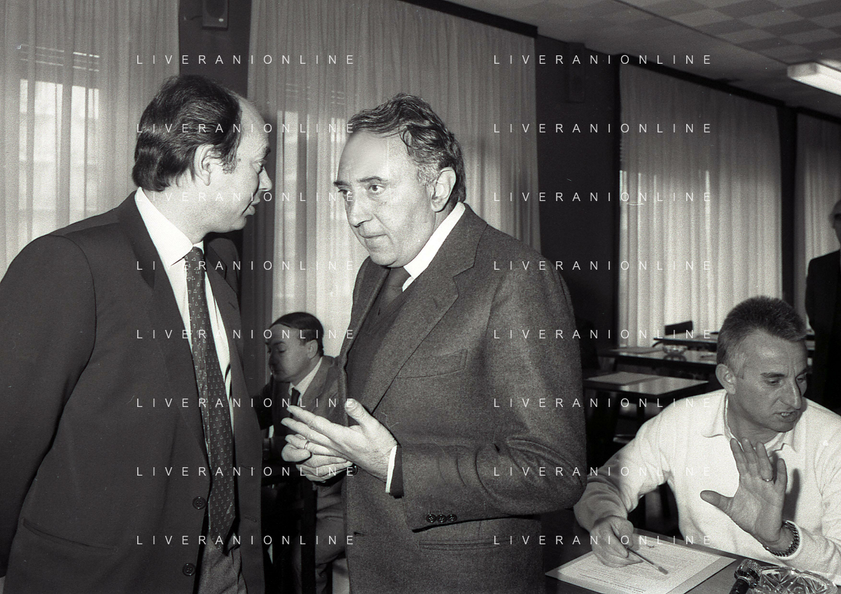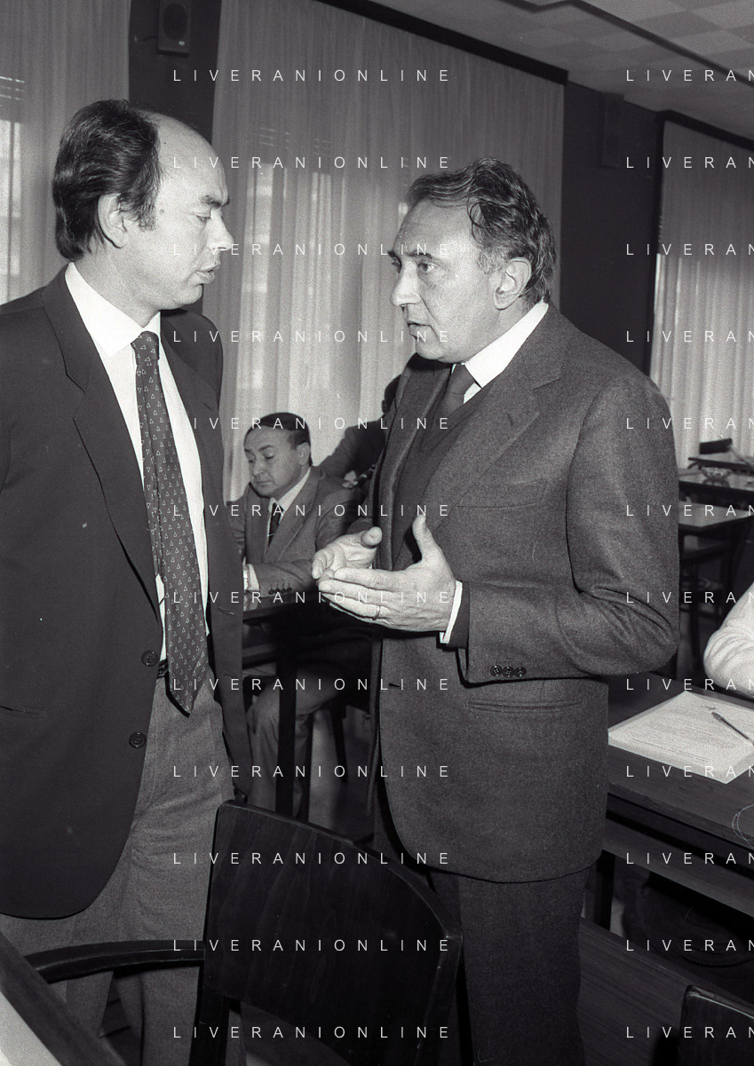 1983 MILANO VIA FILIPPETTI RIUNIONE DEI PRESIDENTI IN LEGA CALCIO NELLA FOTO FRANCO D'ATTOMA PRESIDENTE PERUGIA CALCIO CON IVANOE FRAIZZOLI AG ALDO LIVERANI SAS