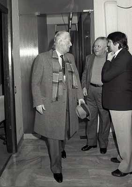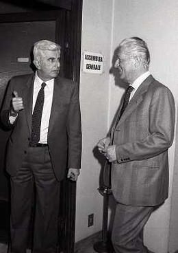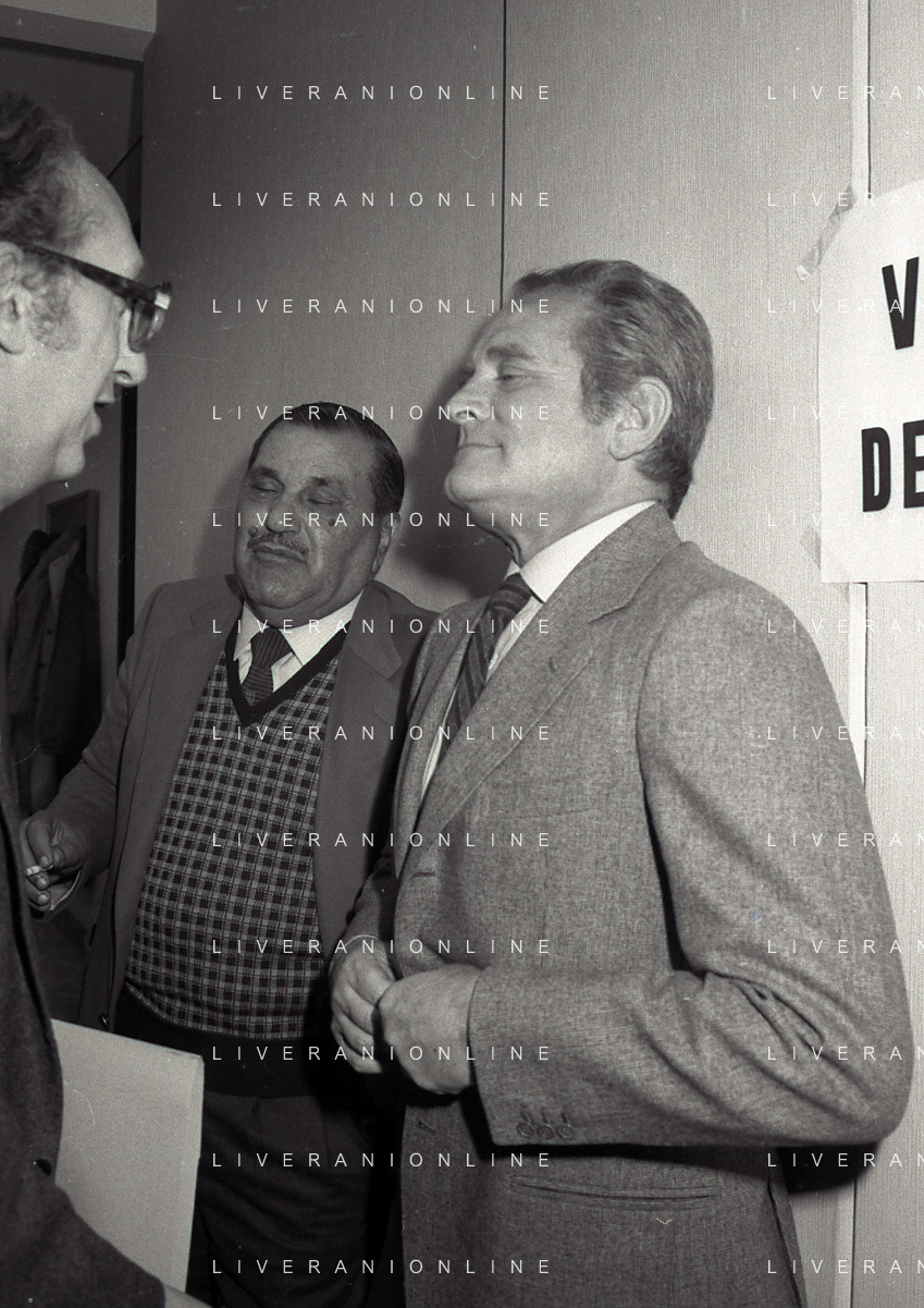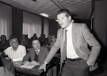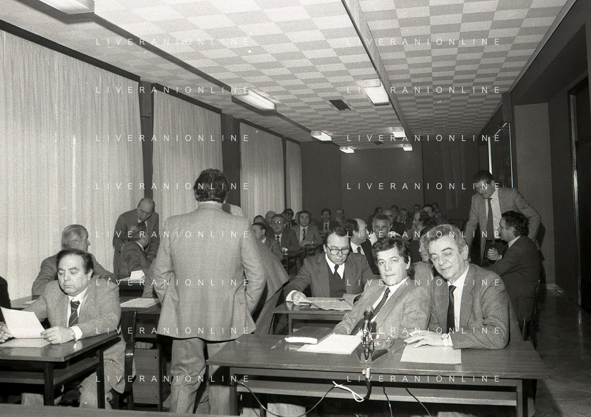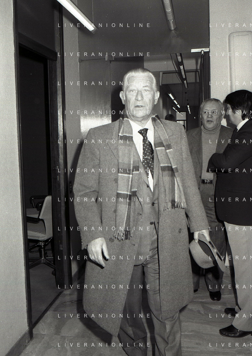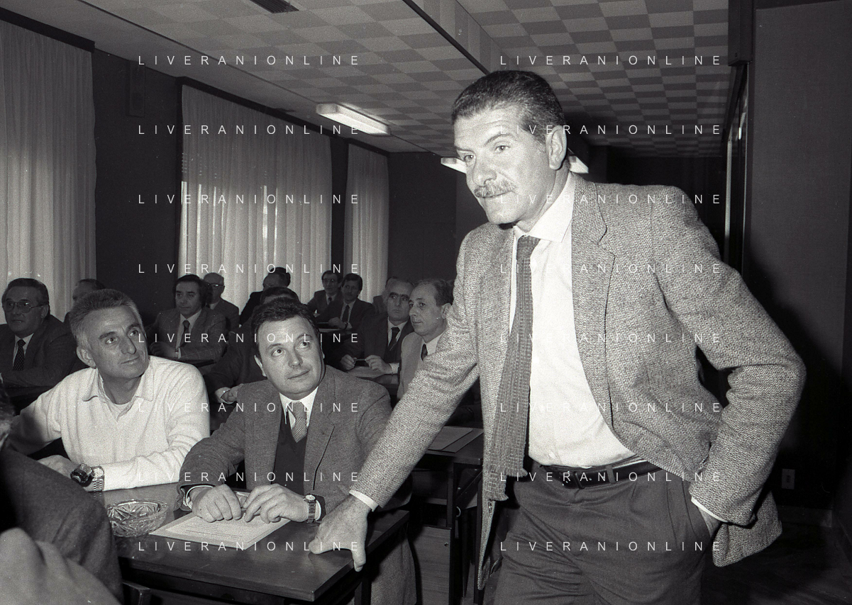 1983 MILANO VIA FILIPPETTI RIUNIONE DEI PRESIDENTI IN LEGA CALCIO NELLA FOTO FRANCO D'ATTOMA PRESIDENTE PERUGIA CALCIO CON IVANOE FRAIZZOLI AG ALDO LIVERANI SAS