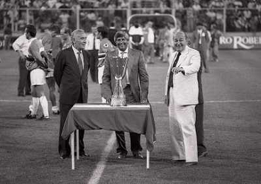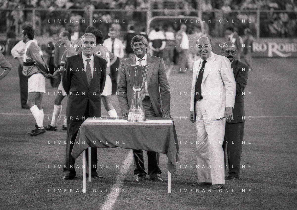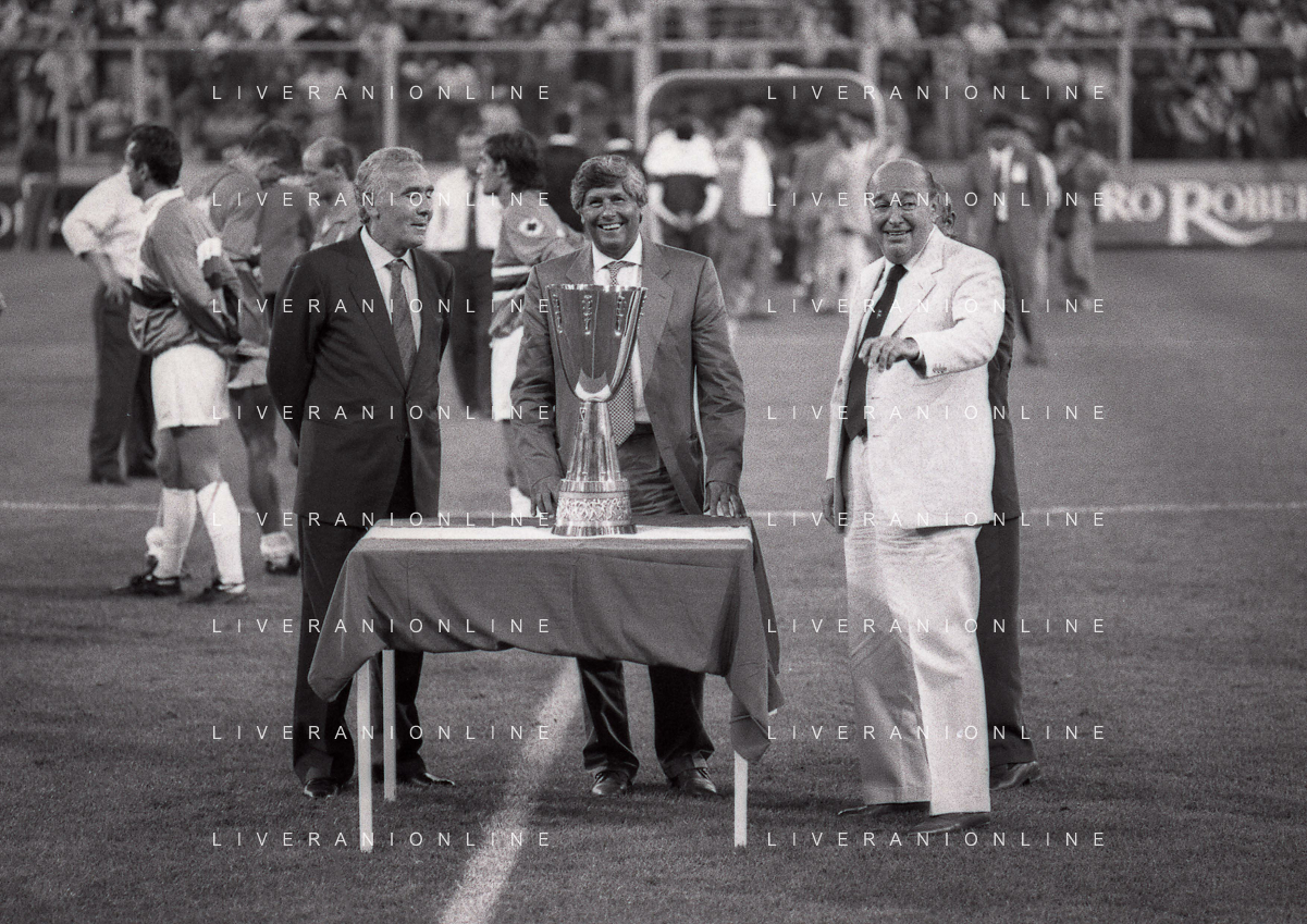 24-08-1991 GENOVA-SUPERCOPPA ITALIANA FINALE SAMPDORIA ROMA 1-0 NELLA FOTO GIUSEPPE CIARRAPICO PRESIDENTE ROMA CON LEONE AG ALDO LIVERANI SAS
