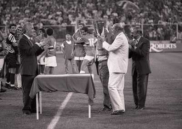 SAMPDORIA - ROMA SUPERCOPPA ITALIANA GENOVA 24.08.1991 NELLA FOTO L'ESULTANZA E I FESTEGGIAMENTI A FINE GARA DELLA SAMPDORIA CON IL TROFEO DOPO LA VITTORIA - IL PRESIDENTE PAOLO MANTOVANI CON MICHELE TIGANI AG ALDO LIVERANI SAS