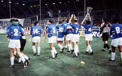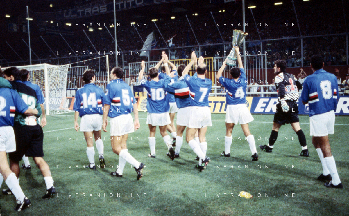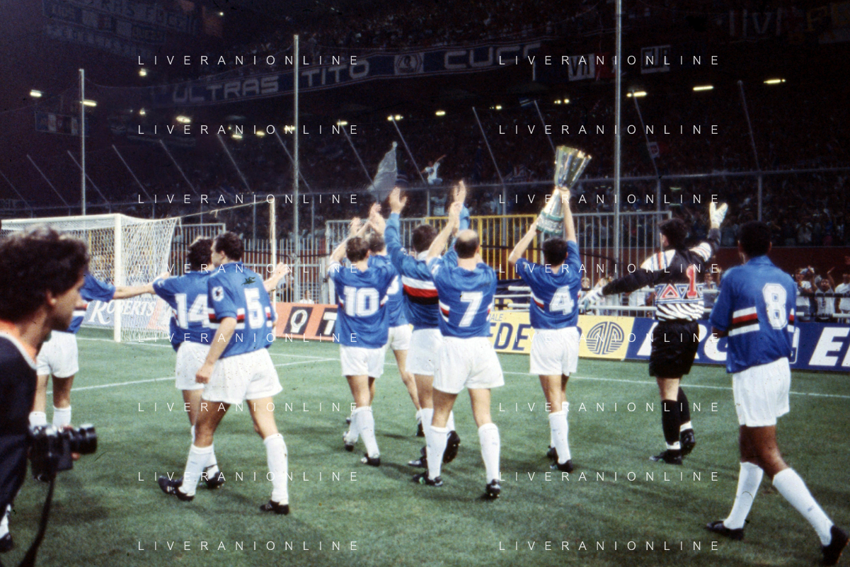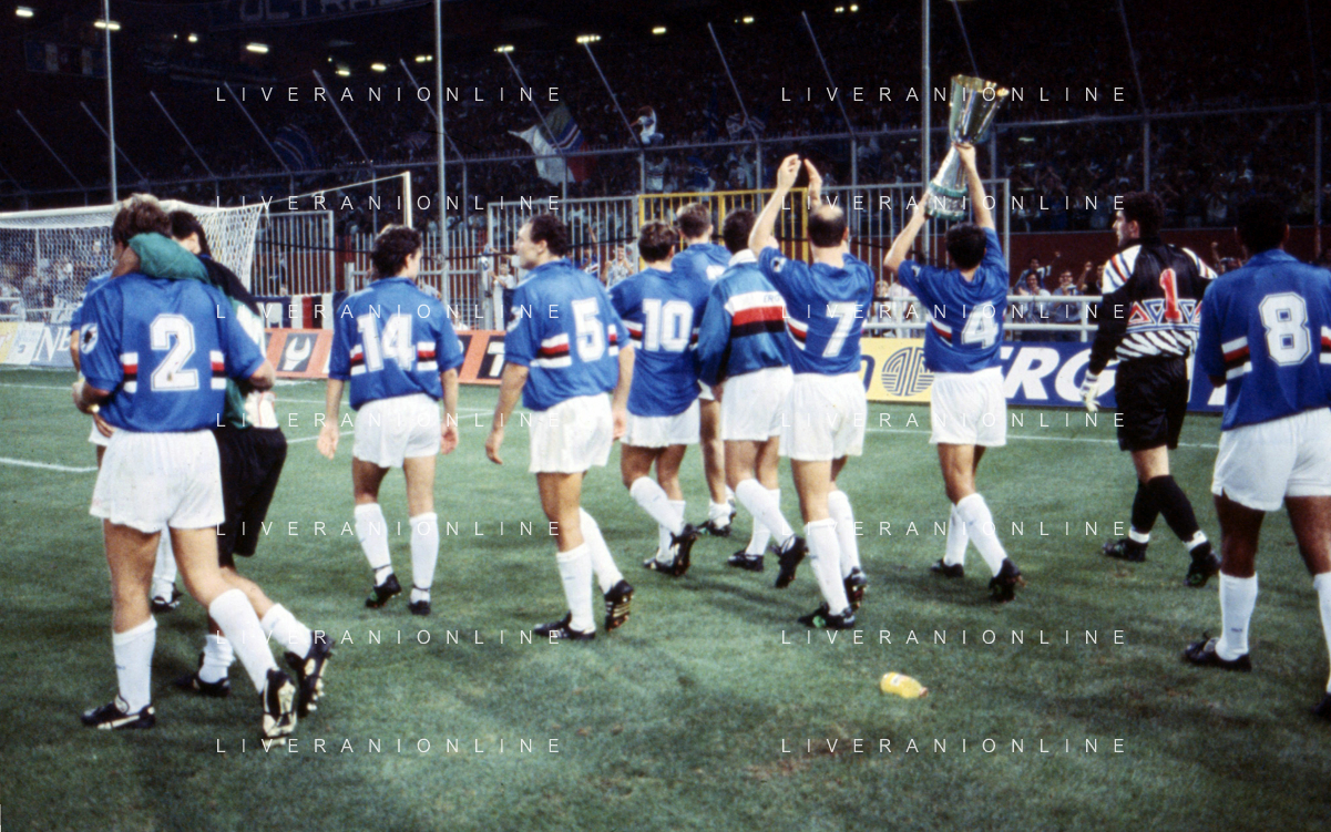 SAMPDORIA - ROMA SUPERCOPPA ITALIANA GENOVA 24.08.1991 NELLA FOTO L'ESULTANZA E I FESTEGGIAMENTI A FINE GARA DEI GIOCATORI DELLA SAMPDORIA CON IL TROFEO DOPO LA VITTORIA AG ALDO LIVERANI SAS