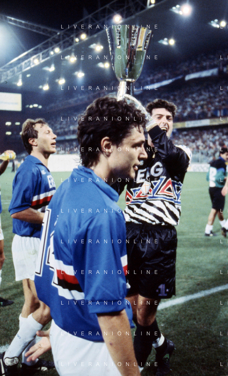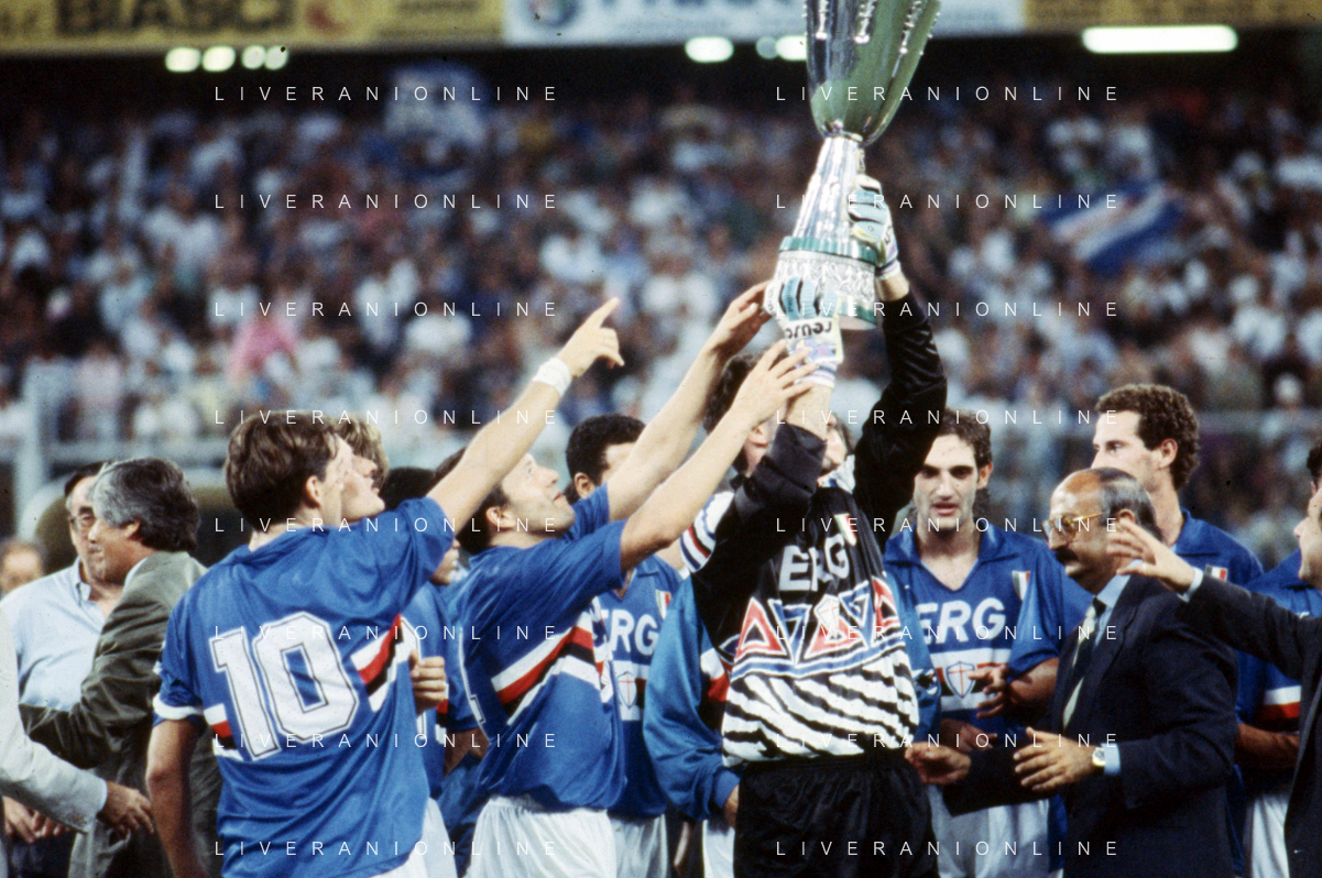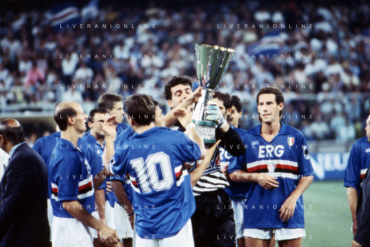 SAMPDORIA - ROMA SUPERCOPPA ITALIANA GENOVA 24.08.1991 NELLA FOTO L'ESULTANZA E I FESTEGGIAMENTI A FINE GARA DEI GIOCATORI DELLA SAMPDORIA CON IL TROFEO DOPO LA VITTORIA GIANLUCA PAGLIUCA ALZA LA COPPA AG ALDO LIVERANI SAS