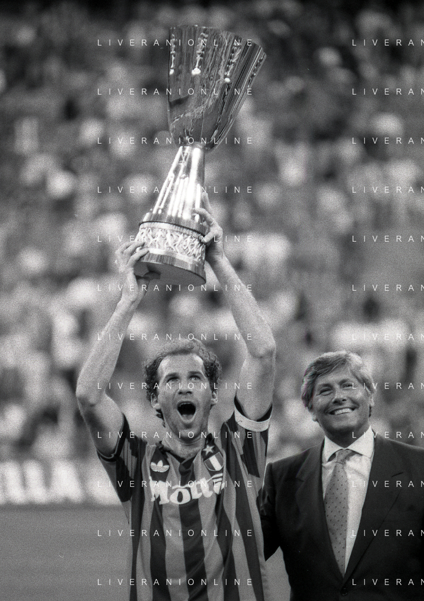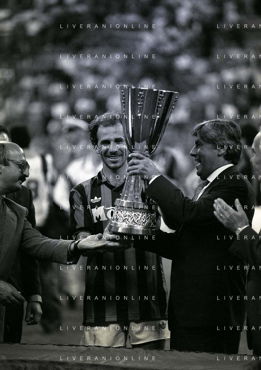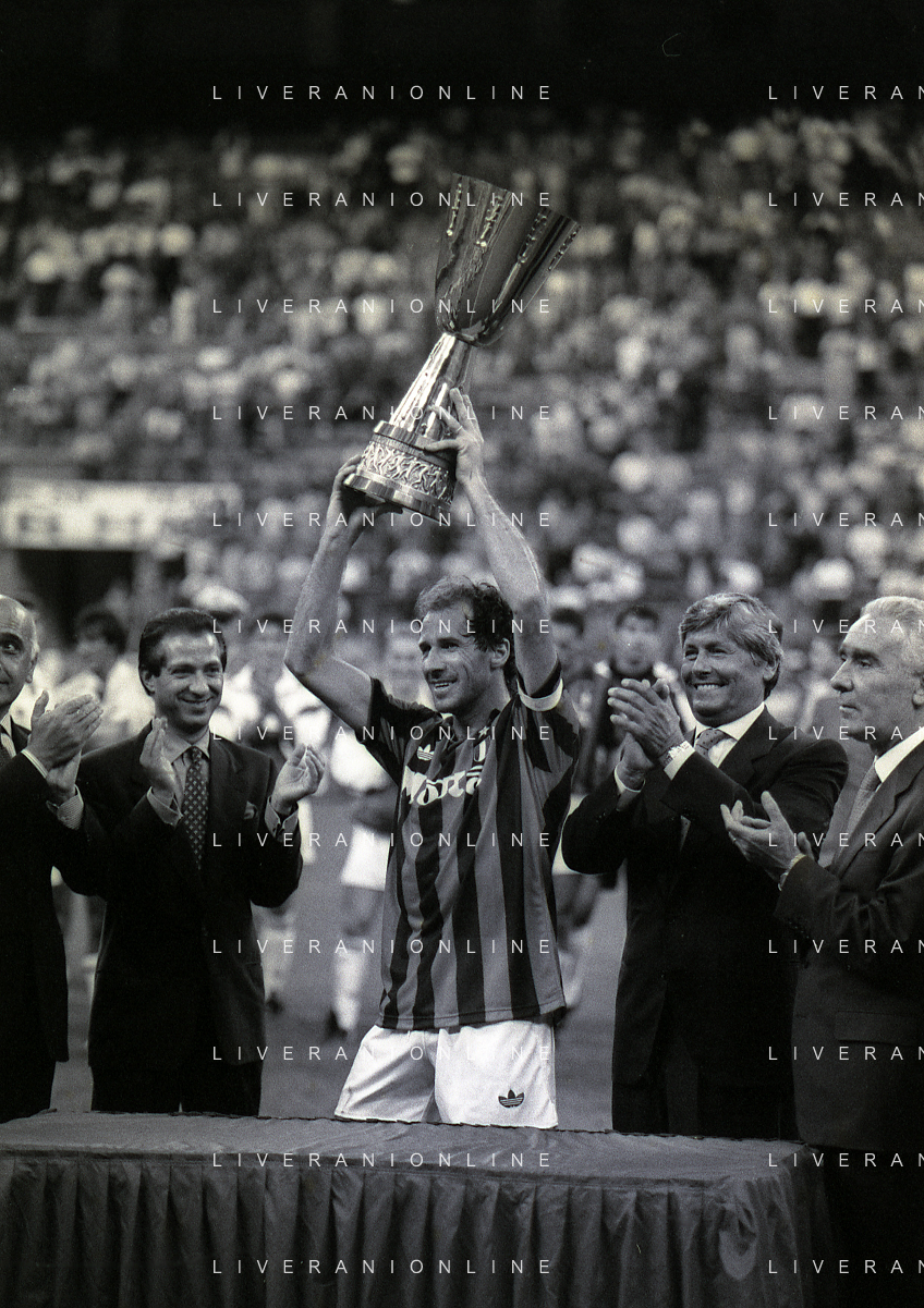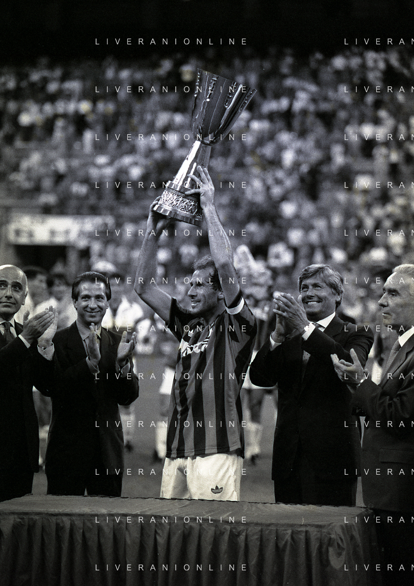 30-08-1992 MILANO FINALE DI SUPERCOPPA ITALIANA MILAN PARMA 2-1 NELLA FOTO JEAN PIERRE PAPIN CON LA SUPERCOPPA ITALIANA AG ALDO LIVERANI SAS