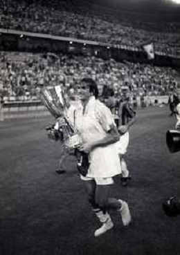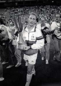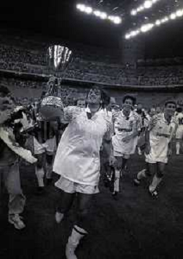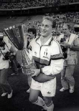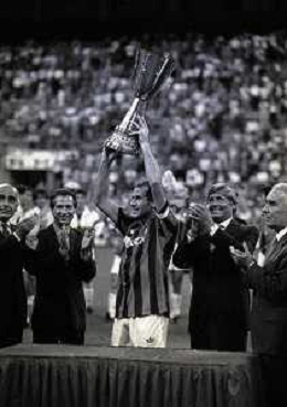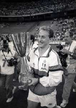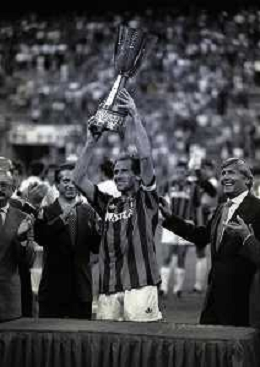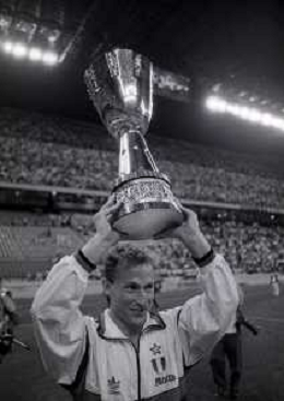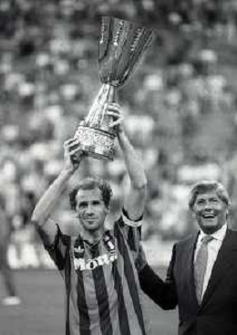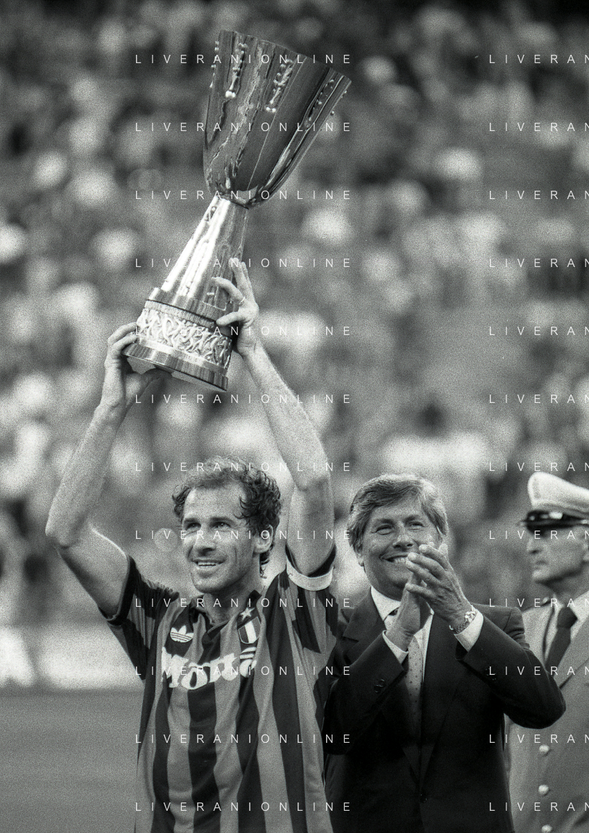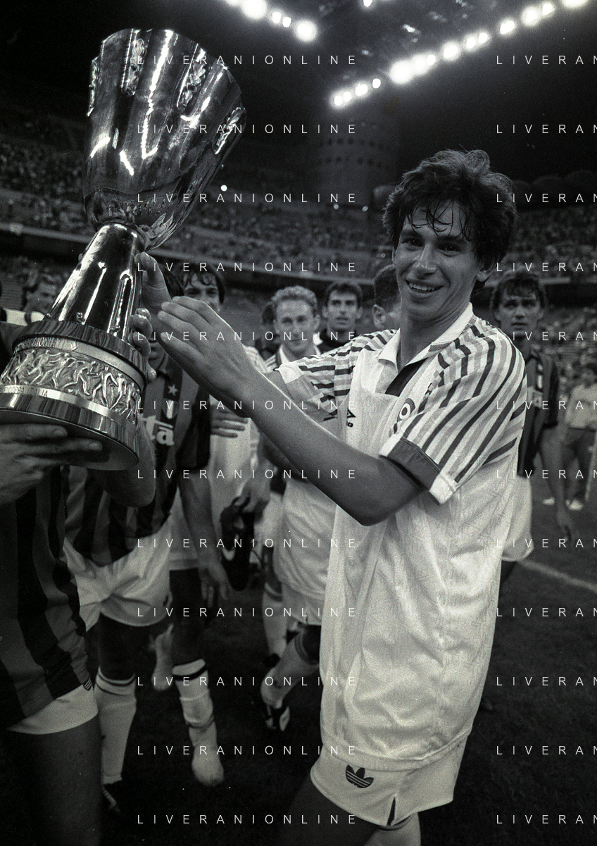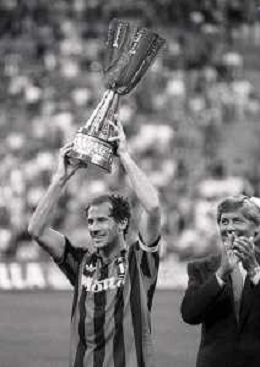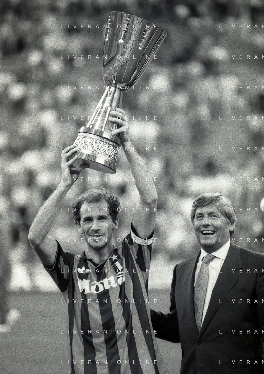 30-08-1992 MILANO FINALE DI SUPERCOPPA ITALIANA MILAN PARMA 2-1 NELLA FOTO JEAN PIERRE PAPIN CON LA SUPERCOPPA ITALIANA AG ALDO LIVERANI SAS