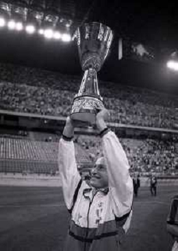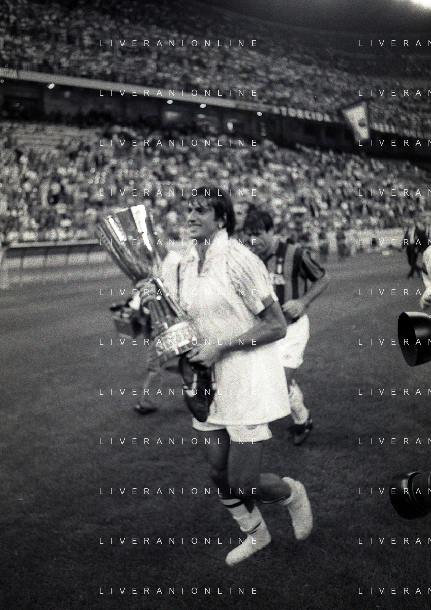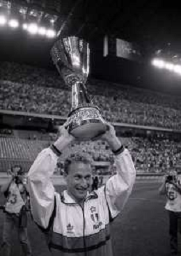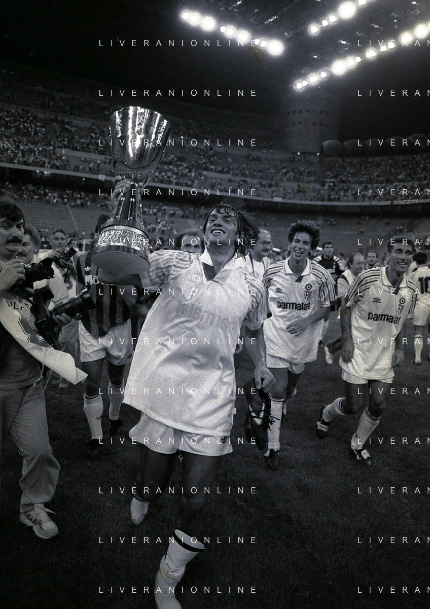 30-08-1992 MILANO FINALE DI SUPERCOPPA ITALIANA MILAN PARMA 2-1 NELLA FOTO ALBERICO EVANI CON LA SUPERCOPPA ITALIANA AG ALDO LIVERANI SAS