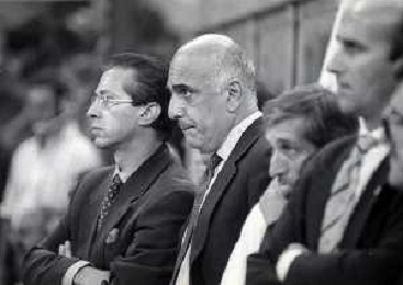30-08-1992 MILANO FINALE DI SUPERCOPPA ITALIANA MILAN PARMA 2-1 NELLA FOTO ARRIGO SACCHI SILVIO BERLUSCONI E CARLO ANCELOTTI AG ALDO LIVERANI SAS