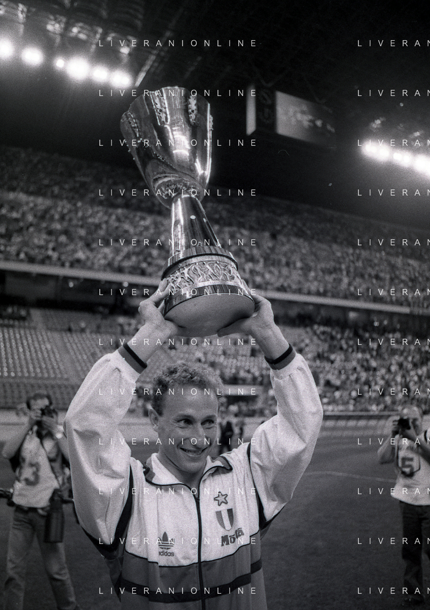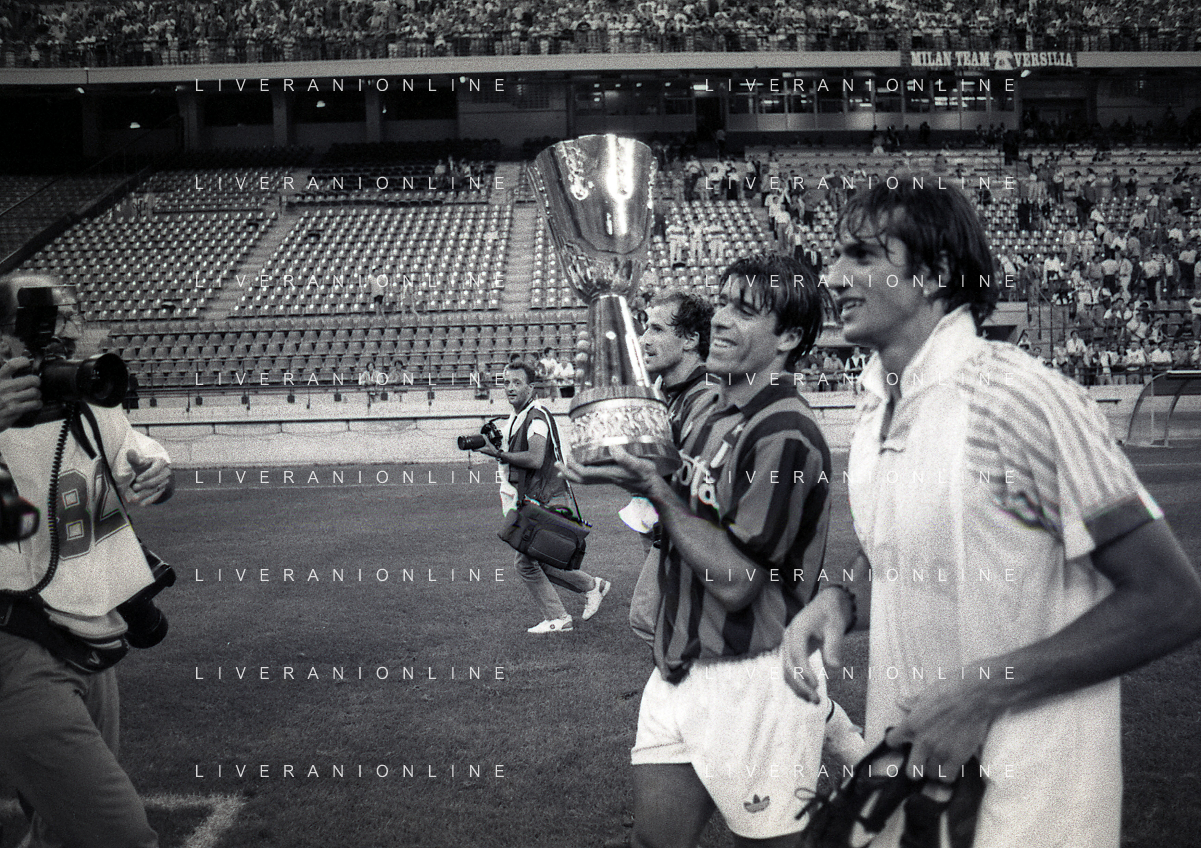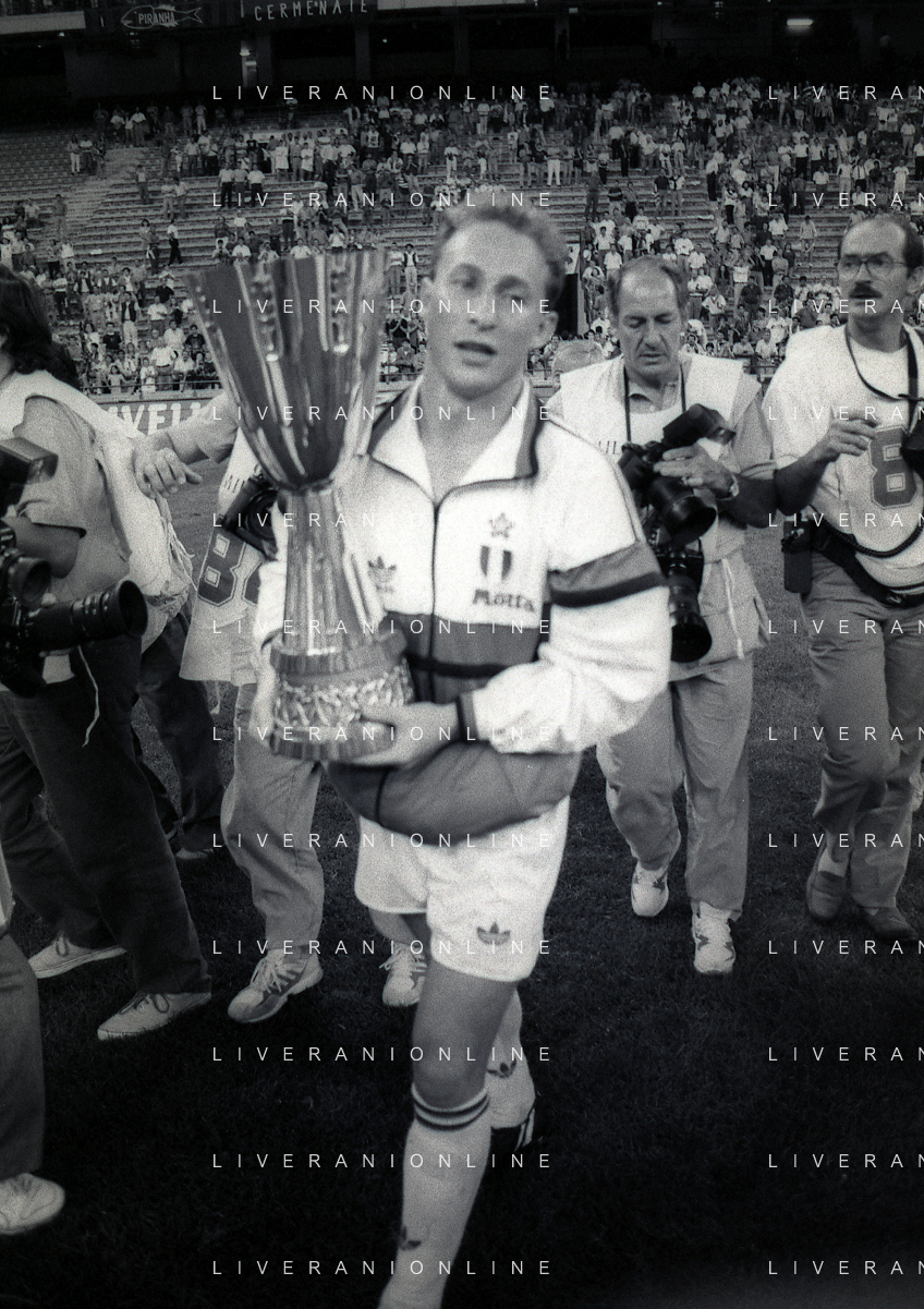 30-08-1992 MILANO FINALE DI SUPERCOPPA ITALIANA MILAN PARMA 2-1 NELLA FOTO DEMETRIO ALBERTINI CON LA SUPERCOPPA ITALIANA AG ALDO LIVERANI SAS
