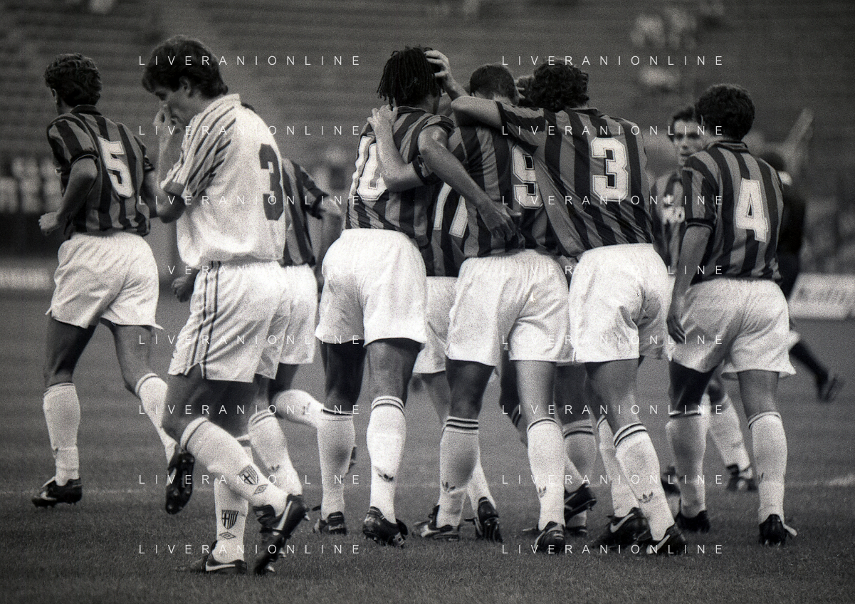 30-08-1992 MILANO FINALE DI SUPERCOPPA ITALIANA MILAN PARMA 2-1 NELLA FOTO ABBRACCI GIOCATORI MILAN AG ALDO LIVERANI SAS