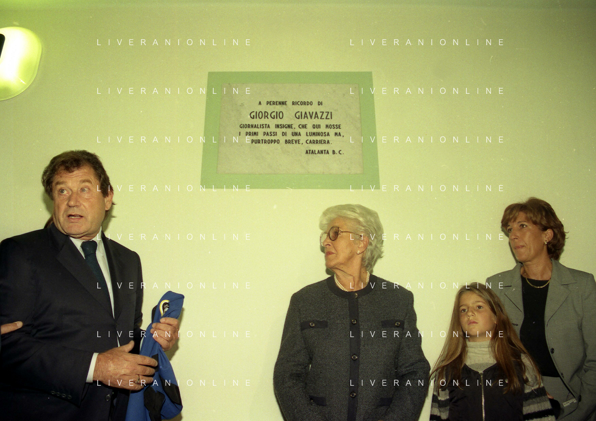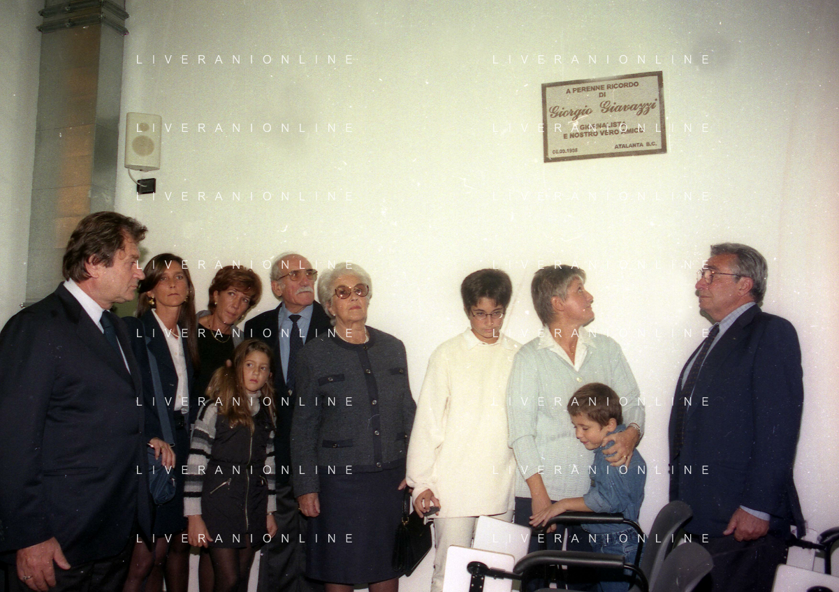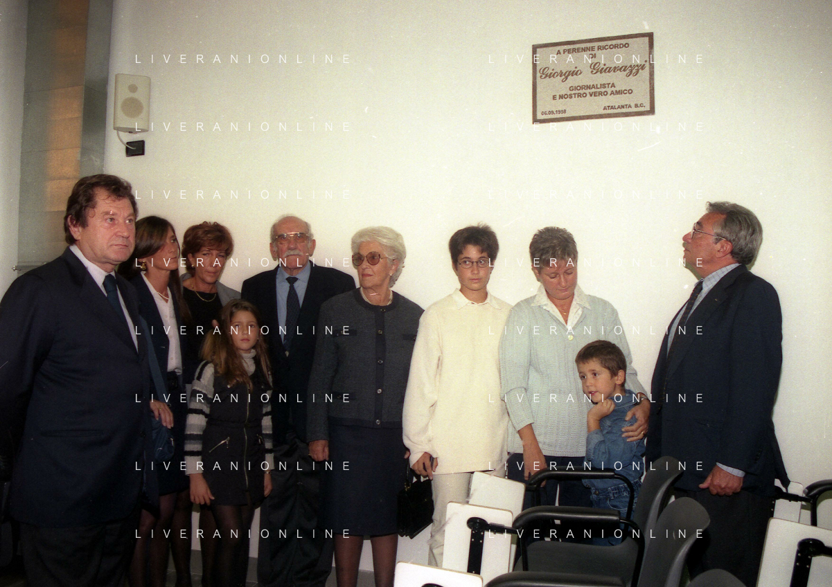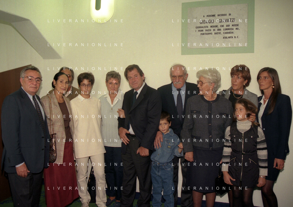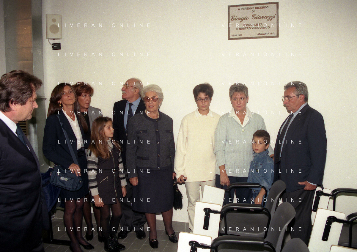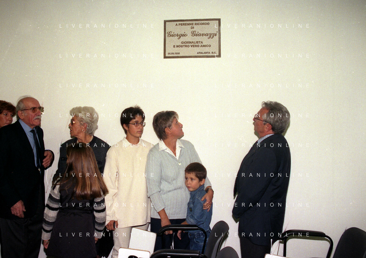 27-09-1998 -BERGAMO CAMPIONATO DI CALCIO SERIE B ATALANTA TERNANA 1-0 NELLA FOTO IL PRESIDENTE DELL'ATALANTA IVAN RUGGERI CON CANDIDO CANNAVO' E I FAMIGLIARI DI GIORGIO GIAVAZZI PER L'INTESTAZIONE DELLA SALA STAMPA DELLO STADIO DI BERGAMO IN MEMORIA DEL GIORNALISTA GIORGIO GIAVAZZI AG ALDO LIVERANI SAS