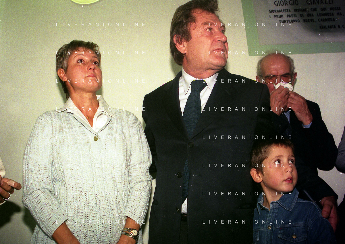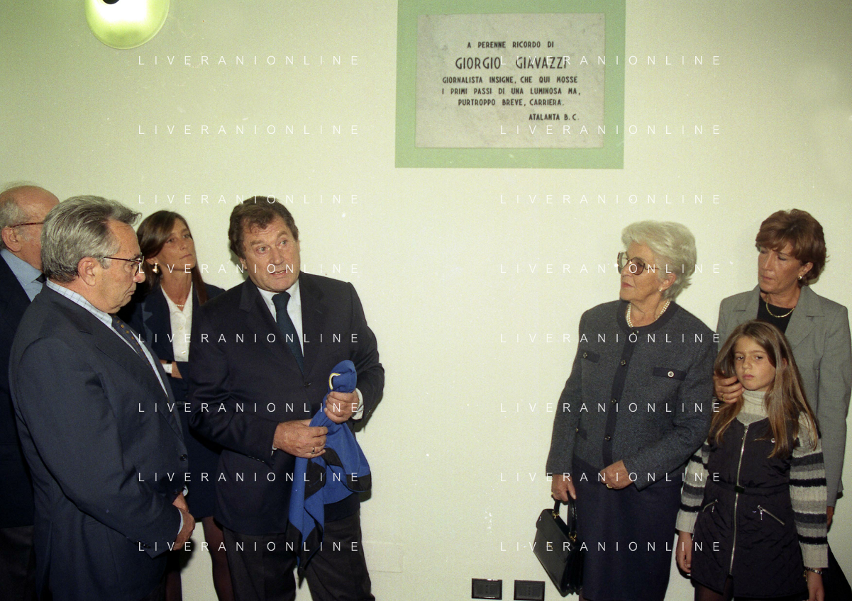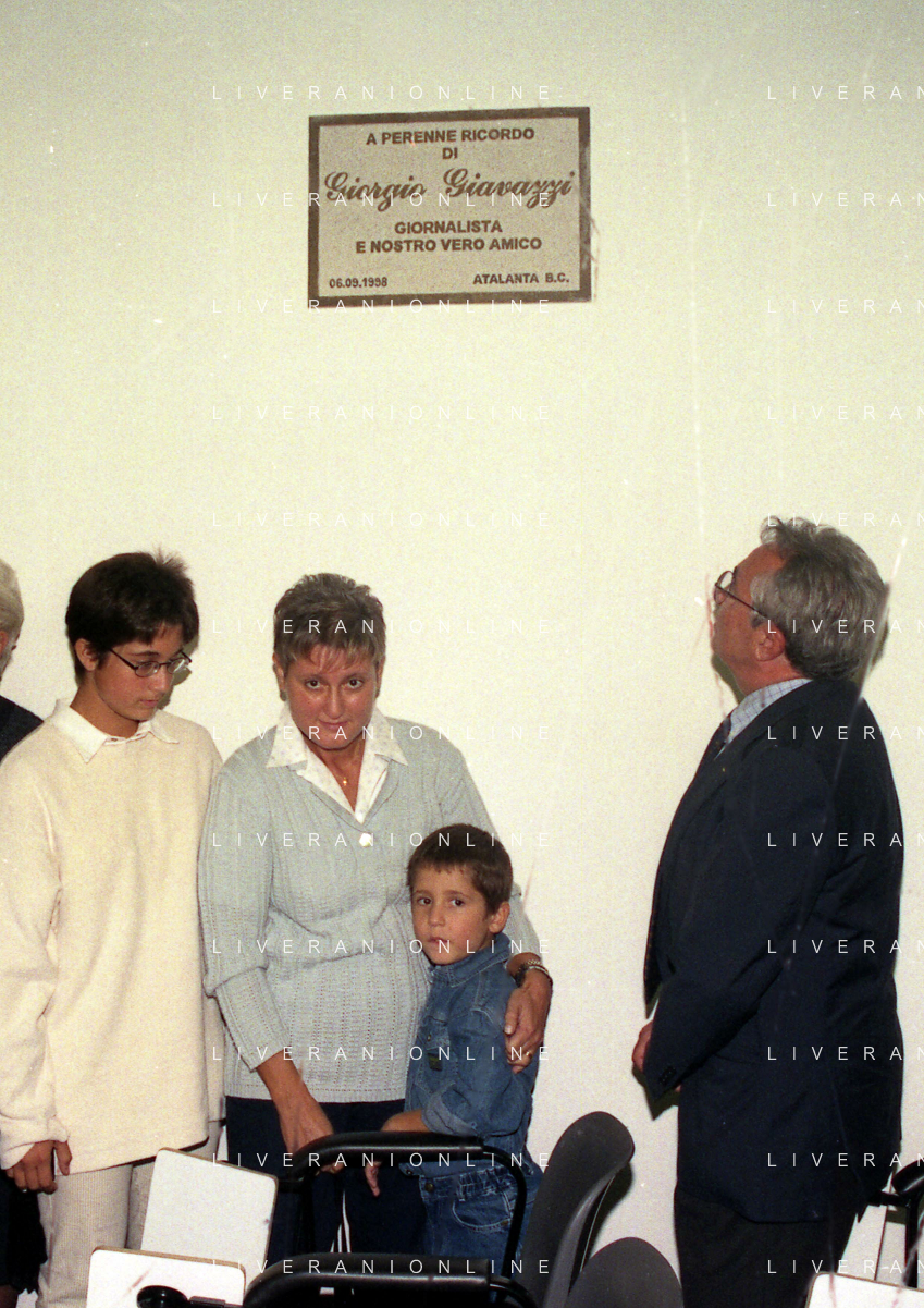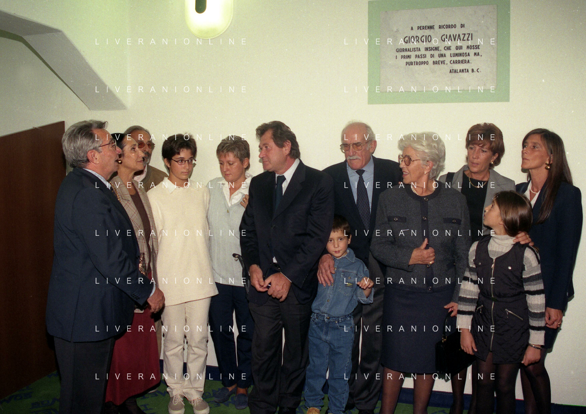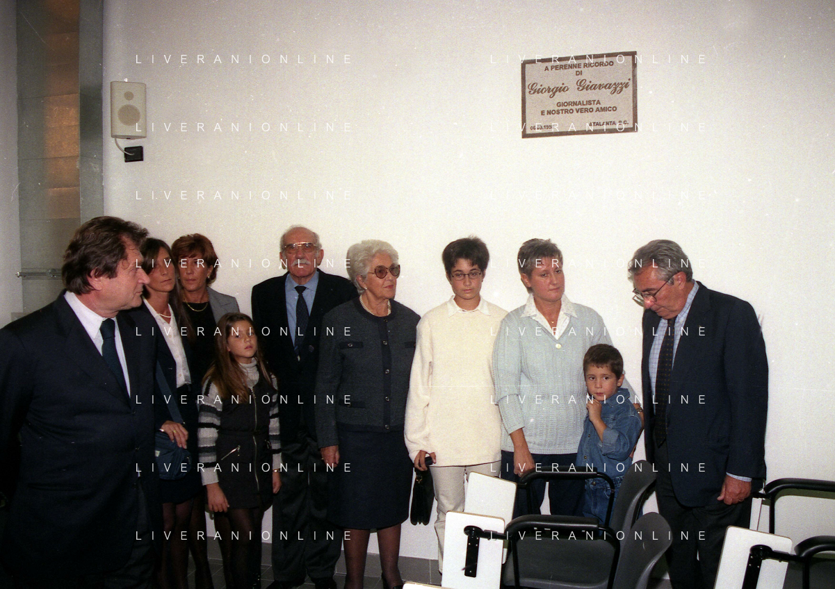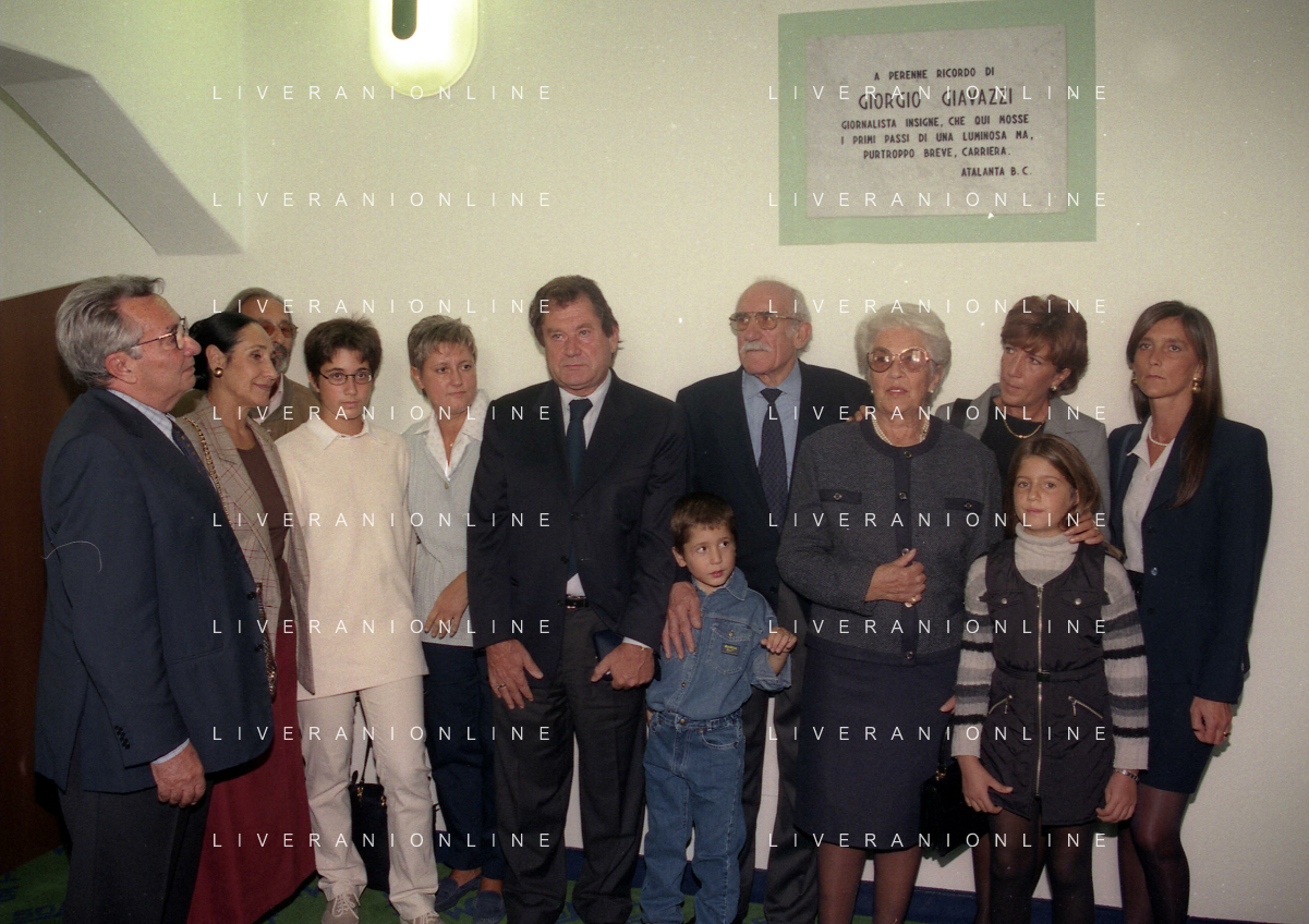 27-09-1998 -BERGAMO CAMPIONATO DI CALCIO SERIE B ATALANTA TERNANA 1-0 NELLA FOTO IL PRESIDENTE DELL'ATALANTA IVAN RUGGERI CON CANDIDO CANNAVO' E I FAMIGLIARI DI GIORGIO GIAVAZZI PER L'INTESTAZIONE DELLA SALA STAMPA DELLO STADIO DI BERGAMO IN MEMORIA DEL GIORNALISTA GIORGIO GIAVAZZI AG ALDO LIVERANI SAS