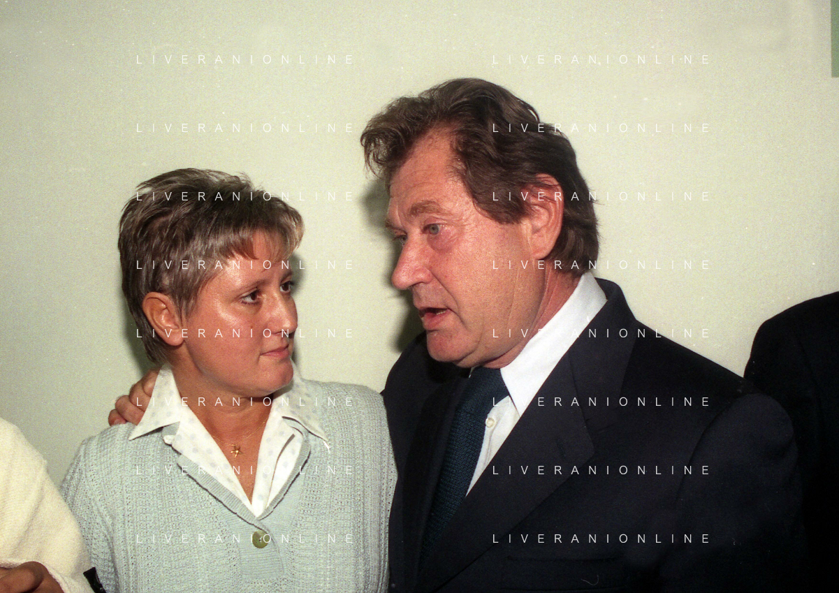 27-09-1998 -BERGAMO CAMPIONATO DI CALCIO SERIE B ATALANTA TERNANA 1-0 NELLA FOTO FABIO BIANCHI LA MOGLIE DI GIORGIO GIAVAZZI GUIA CON ILDO SERRANTONI PER LA COMMEMORAZIONE NELLA SALA STAMPA DELL'ATALANTA CALCIO in memoria del giornalista della gazzetta dello sport giorgio giavazzi AG ALDO LIVERANI SAS