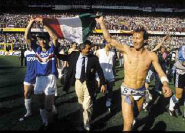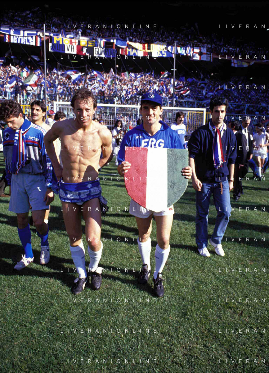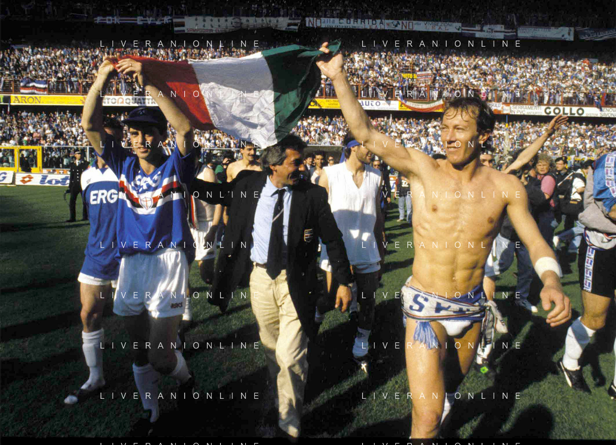 SAMPDORIA - LECCE CAMPIONATO CALCIO SERIE A 19/05/1991 NELLA FOTO ESULTANZA DI MORENO MANNINI E MANCINI ROBERTO COL TRICOLORE VITTORIA DELLO SCUDETTO ANNO 1990/1991 AGENZIA ALDO LIVERANI SAS