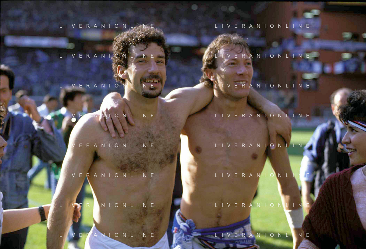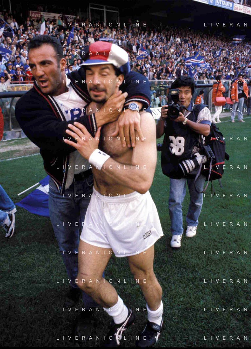SAMPDORIA - LECCE CAMPIONATO CALCIO SERIE A 19/05/1991 NELLA FOTO ESULTANZA DI GIANLUCA VIALLI E MORENO MANNINI VITTORIA DELLO SCUDETTO ANNO 1990/1991 AGENZIA ALDO LIVERANI SAS
