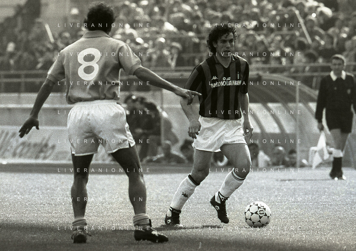 09-04-1989 MILANO-CAMPIONATO DI CALCIO SERIE A MILAN NAPOLI 0-0 NELLA FOTO FRANCESCO ROMANO E ROBERTO DONADONI AG ALDO LIVERANI SAS