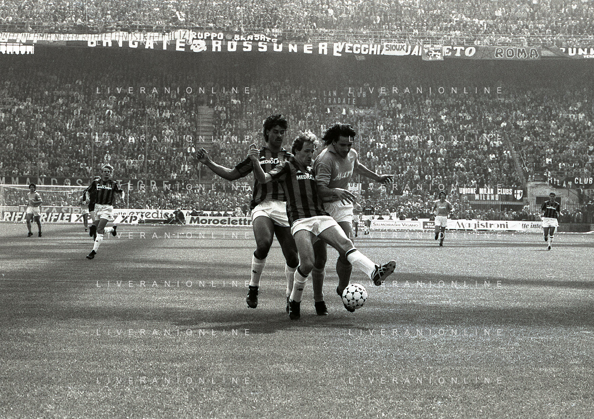 09-04-1989 MILANO-CAMPIONATO DI CALCIO SERIE A MILAN NAPOLI 0-0 NELLA FOTO FRANCO BARESI FRANK RIJKAARD E ANDREA CARNEVALE AG ALDO LIVERANI SAS