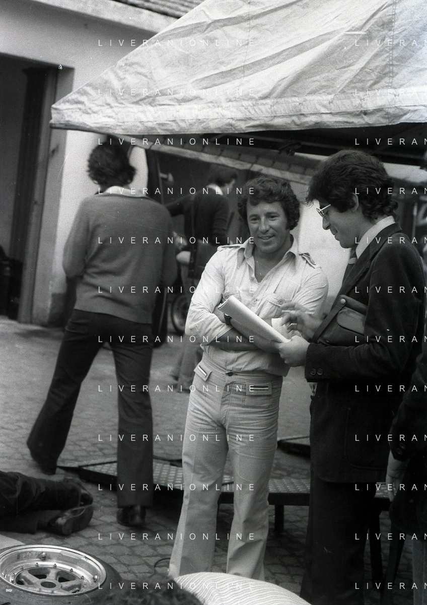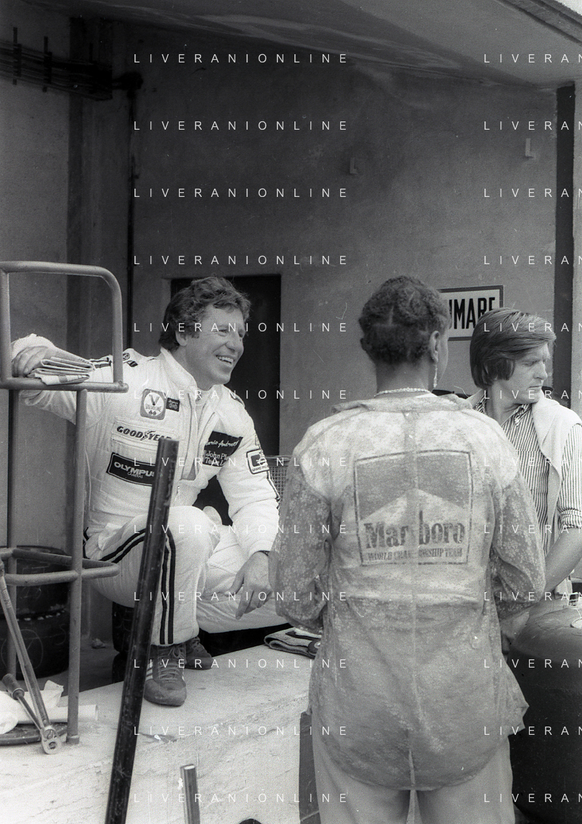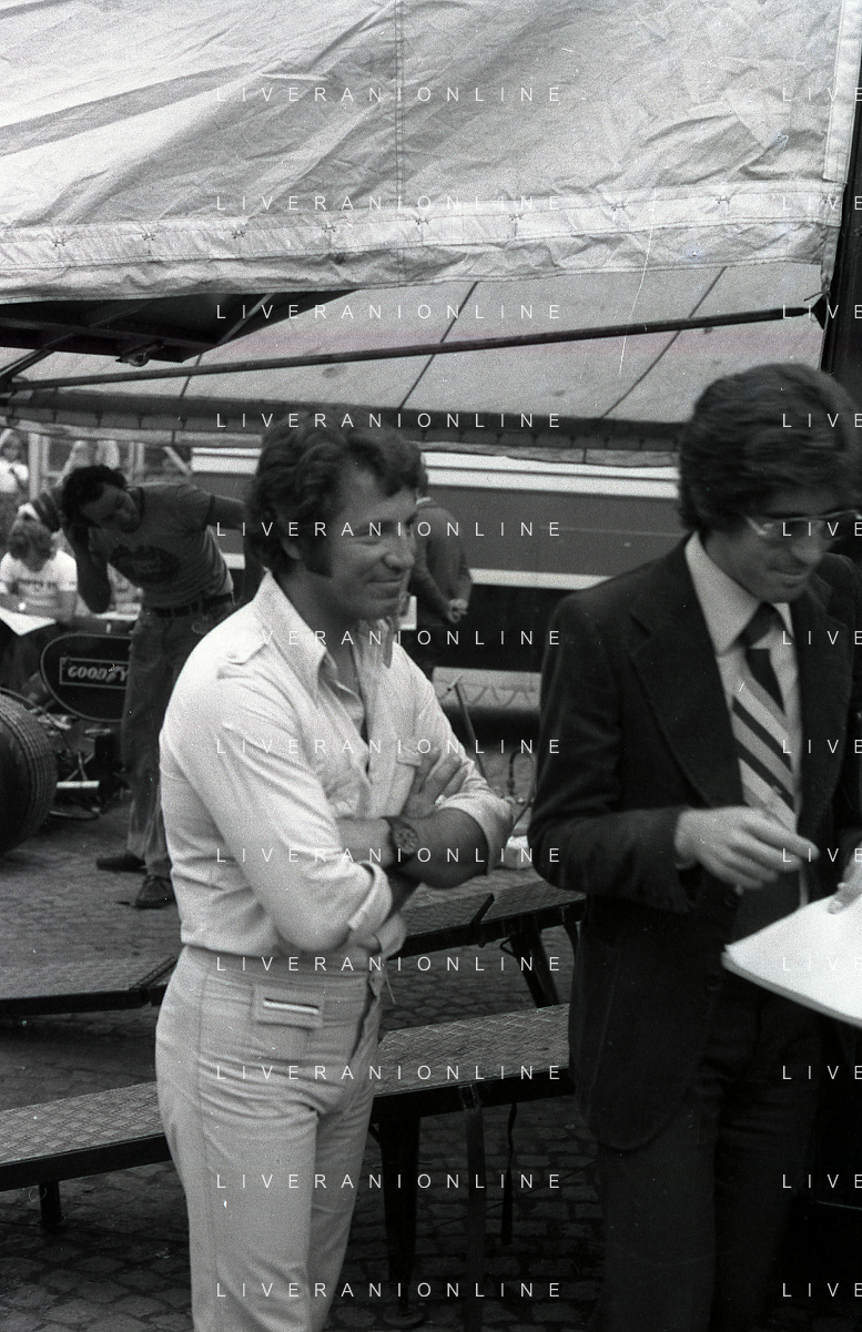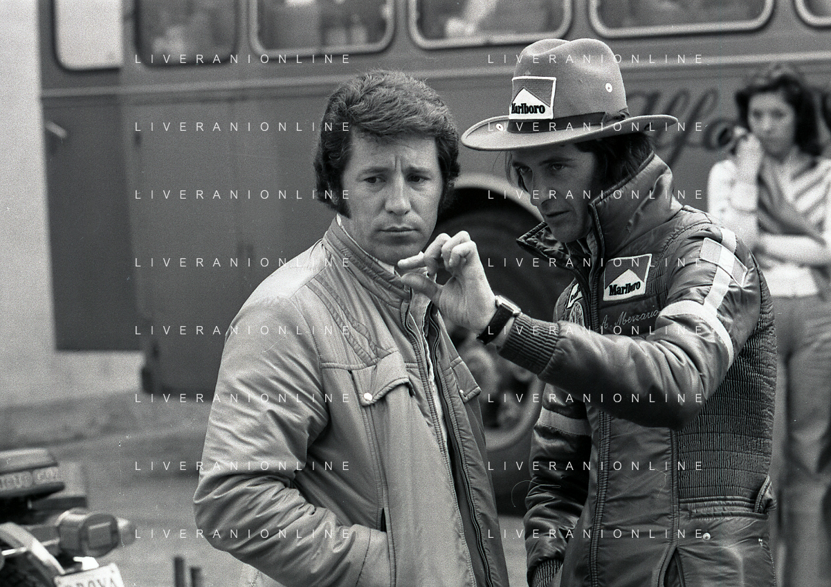 RETROSPETTIVA MARIO ANDRETTI PILOTA F1 NELLA FOTO MARIO ANDRETTI CON ARTURO MERZARIO A MONZA NELL'ANNO 1974 AG ALDO LIVERANI SAS