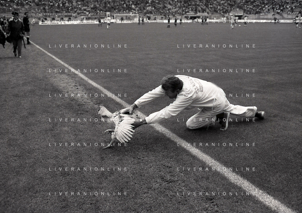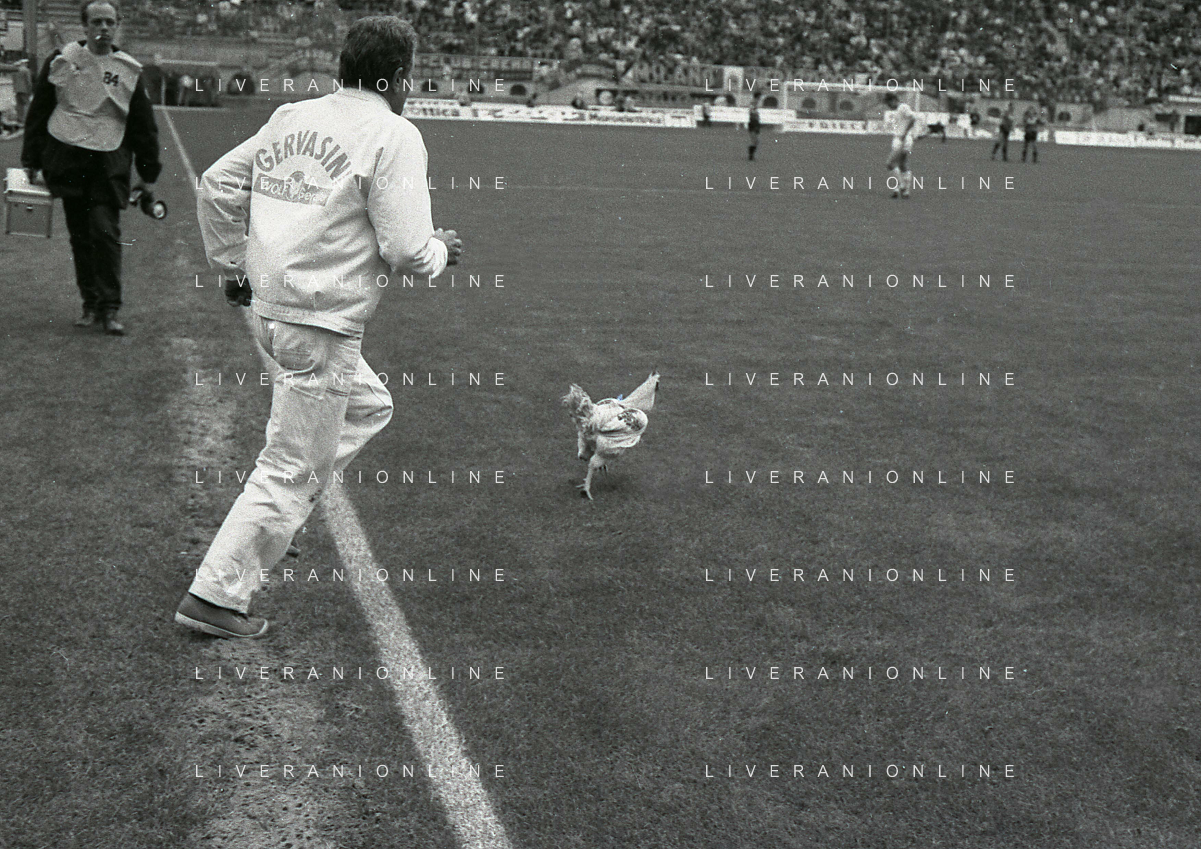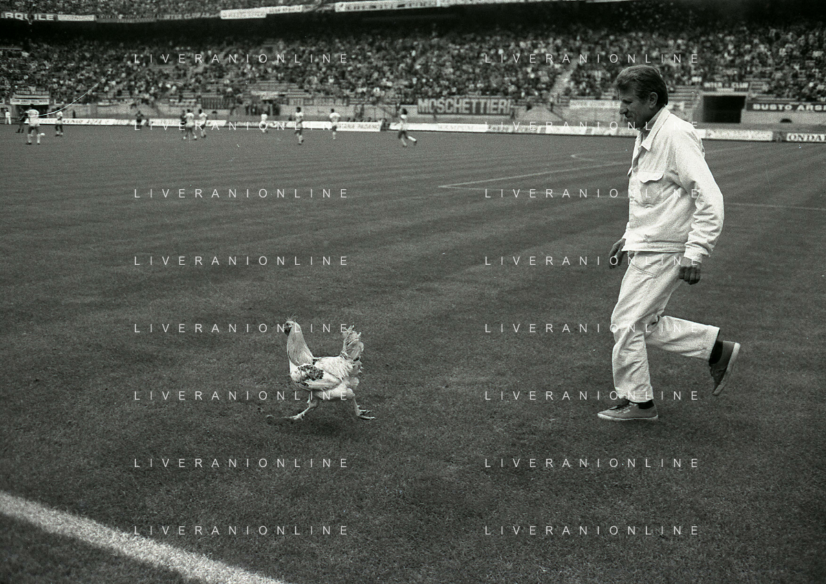 08-10-1989 MILANO CAMPIONATO DI CALCIO SERIE A INTER BARI 1-1 NELLA FOTO IL GIARDINIERE PRENDE IL GALLO LANCIATO IN CAMPO DA ALCUNI TIFOSI DEL BARI CALCIO AG ALDO LIVERANI SAS