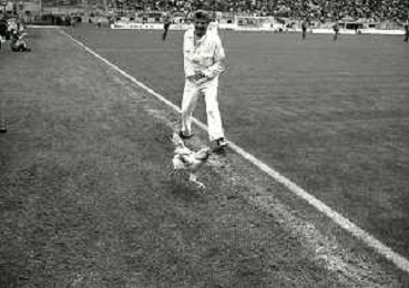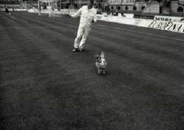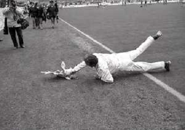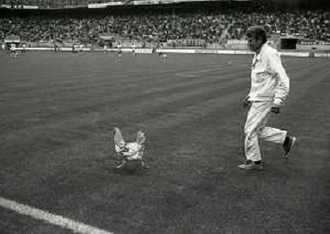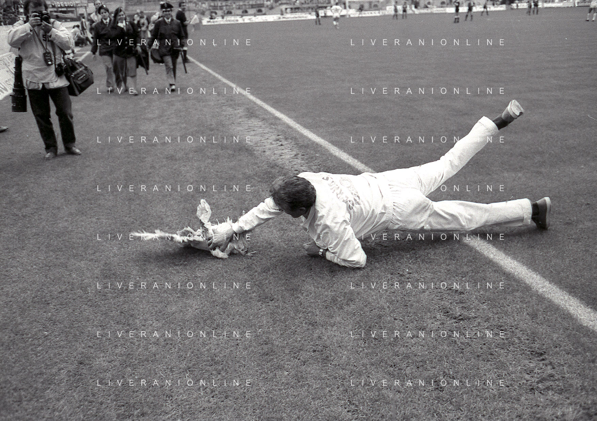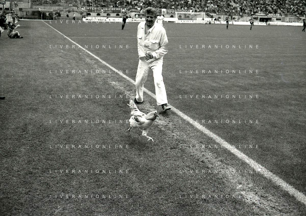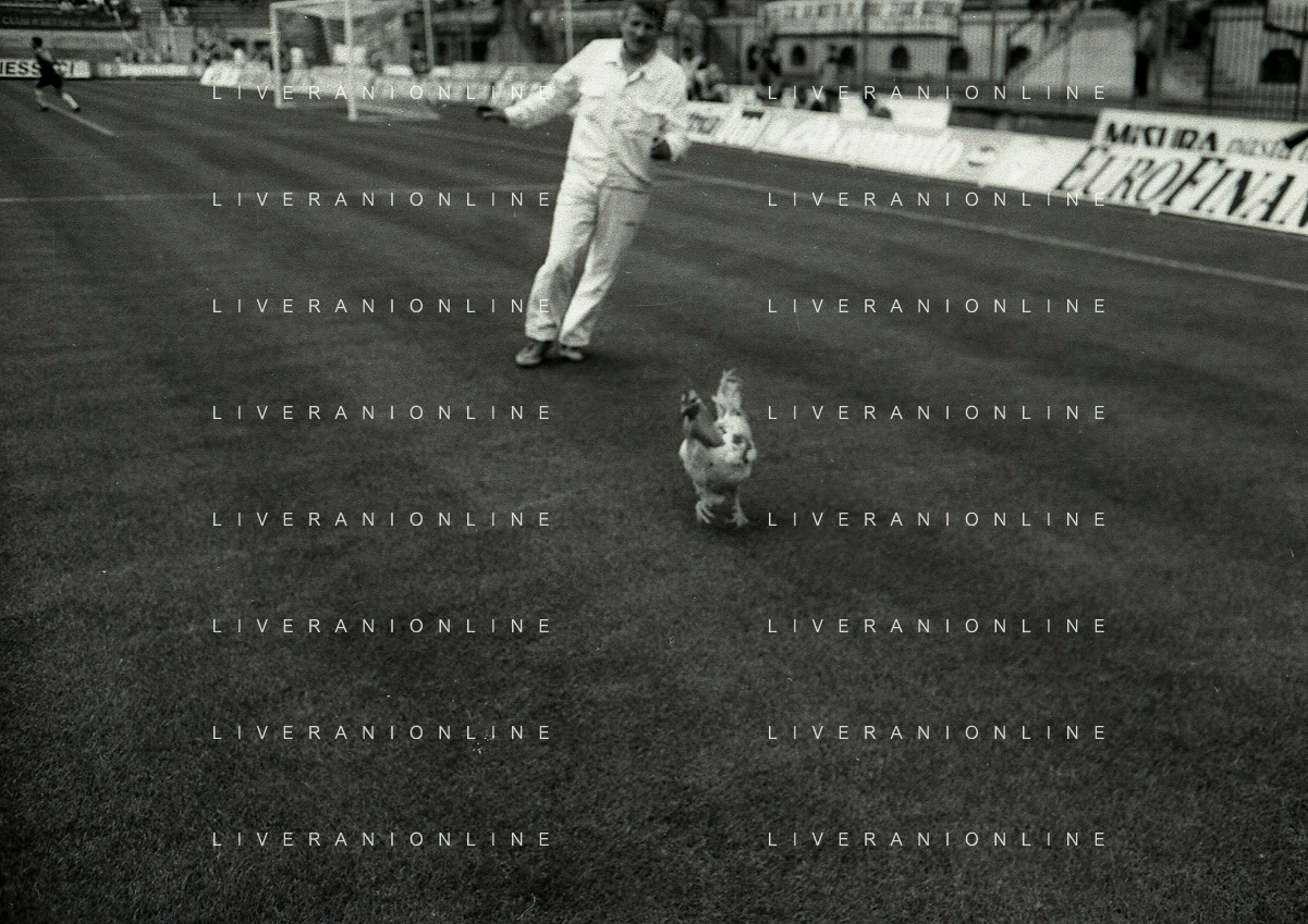 08-10-1989 MILANO CAMPIONATO DI CALCIO SERIE A INTER BARI 1-1 NELLA FOTO IL GIARDINIERE PRENDE IL GALLO LANCIATO IN CAMPO DA ALCUNI TIFOSI DEL BARI CALCIO AG ALDO LIVERANI SAS