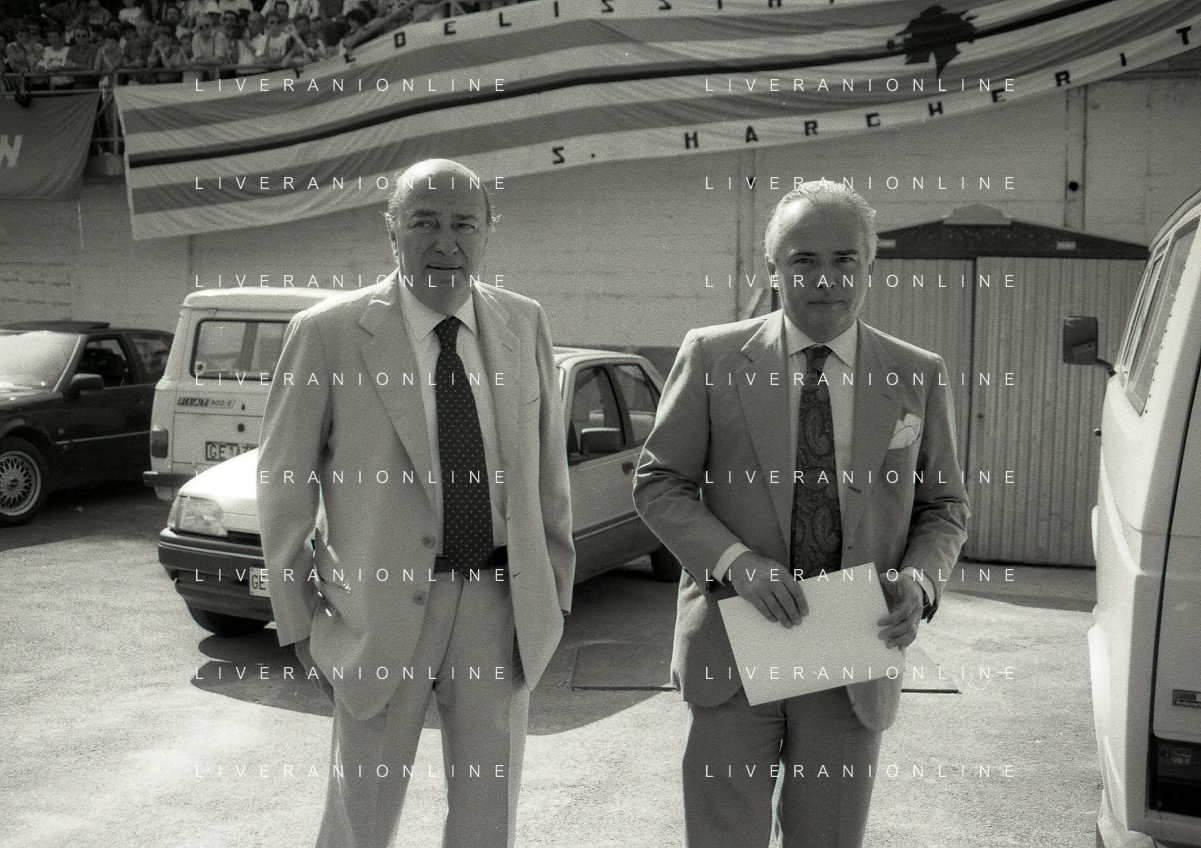 RETROSPETTIVA PAOLO MANTOVANI PRESIDENTE SAMPDORIA CALCIO NELLA FOTO PAOLO MANTOVANI PRESIDENTE DELLA SAMPDORIA CALCIO NELL'ANNO 1991-1992 E ANTONIO PERCASSI AG ALDO LIVERANI SAS