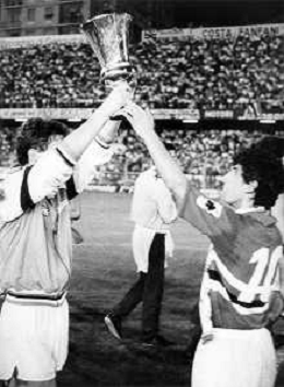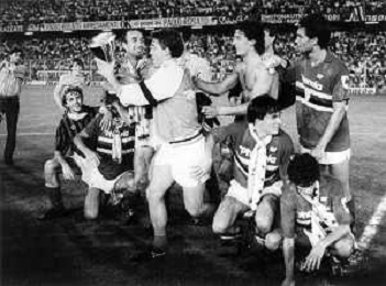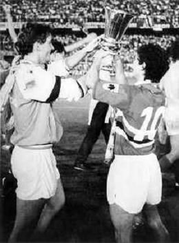 SAMPDORIA - MILAN FINALE RITORNO COPPA ITALIA GENOVA 03.07.1985 - VITTORIA DELLA SAMPDORIA STAGIONE 1984/1985 NELLA FOTO L'ESULTANZA E I FESTEGGIAMENTI DI ROBERTO MANCINI E FAUSTO SALSANO CON IL TROFEO A FINE GARA - AG ALDO LIVERANI SAS