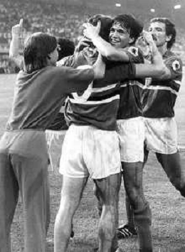 SAMPDORIA - MILAN FINALE RITORNO COPPA ITALIA GENOVA 03.07.1985 - VITTORIA DELLA SAMPDORIA STAGIONE 1984/1985 NELLA FOTO L'ESULTANZA DI FAUSTO PARI E GRAEME SOUNESS - ABBRACCIO DOPO IL GOL DI ROBERTO MANCINI AG ALDO LIVERANI SAS