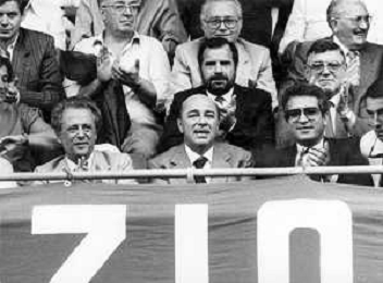 SAMPDORIA - MILAN FINALE RITORNO COPPA ITALIA GENOVA 03.07.1985 - VITTORIA DELLA SAMPDORIA STAGIONE 1984/1985 NELLA FOTO FEDERICO SORDILLO, IL PRESIDENTE PAOLO MANTOVANI, ANTONIO MATARRESE E ROMEO ANCONETANI IN TRIBUNA AG ALDO LIVERANI SAS