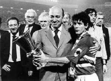 SAMPDORIA - MILAN FINALE RITORNO COPPA ITALIA GENOVA 03.07.1985 - VITTORIA DELLA SAMPDORIA STAGIONE 1984/1985 NELLA FOTO L'ESULTANZA E I FESTEGGIAMENTI DEL PRESIDENTE PAOLO MANTOVANI E FAUSTO SALSANO CON IL TROFEO A FINE GARA AG ALDO LIVERANI SAS
