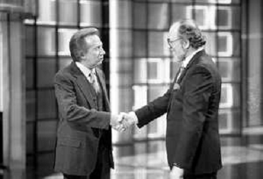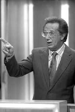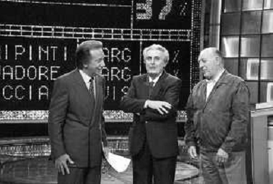 PENTATLON gioco televisivo a premi, trasmesso su Canale 5 nel 1987, condotto da Mike Bongiorno Nella foto con il ciclista gino bartali e vincenzo torriani ©Archivio Giovanni Liverani / AGENZIA ALDO LIVERANI SAS