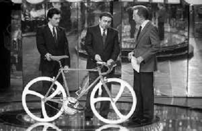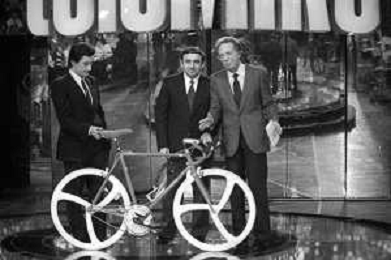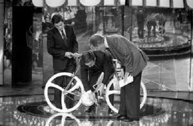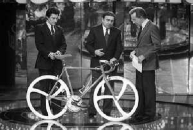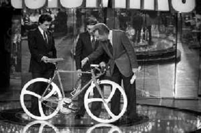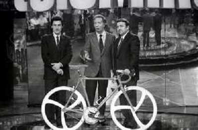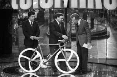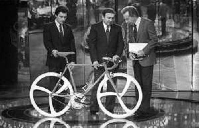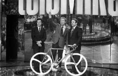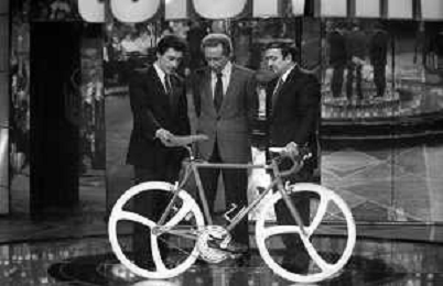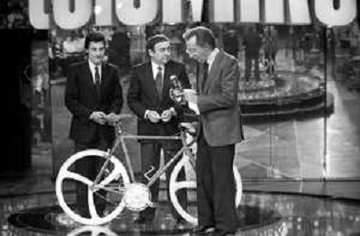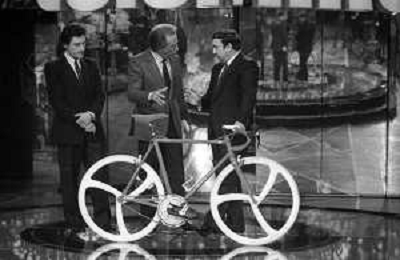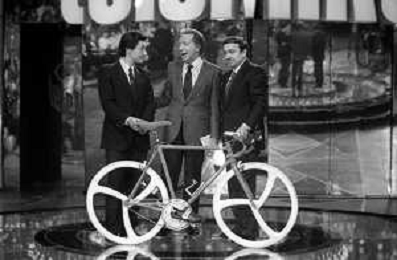 PENTATLON gioco televisivo a premi, trasmesso su Canale 5 nel 1987, condotto da Mike Bongiorno Nella foto con il Ciclista Giuseppe Saronni ed Ernesto Colnago costruttore Biciclette ©Archivio Giovanni Liverani / AGENZIA ALDO LIVERANI SAS