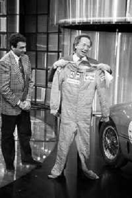 PENTATLON gioco televisivo a premi, trasmesso su Canale 5 nel 1987, condotto da Mike Bongiorno Nella foto con il Pilota di F1 Michele Alboreto e la tuta della Ferrari ©Archivio Giovanni Liverani / AGENZIA ALDO LIVERANI SAS