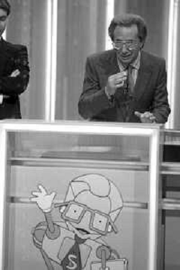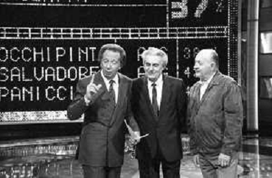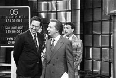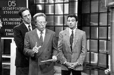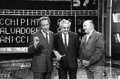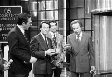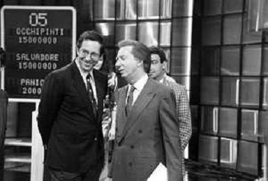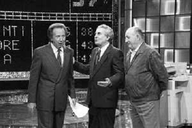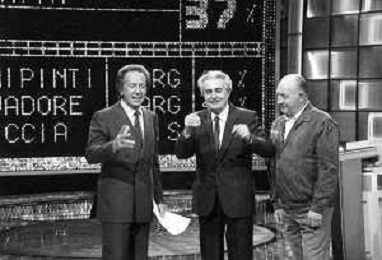 PENTATLON gioco televisivo a premi, trasmesso su Canale 5 nel 1987, condotto da Mike Bongiorno Nella foto con il Pilota di F1 Michele Alboreto e con l'ingegnere della Ferrari Mauro Forghieri ©Archivio Giovanni Liverani / AGENZIA ALDO LIVERANI SAS