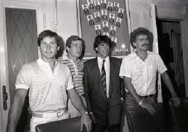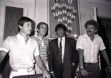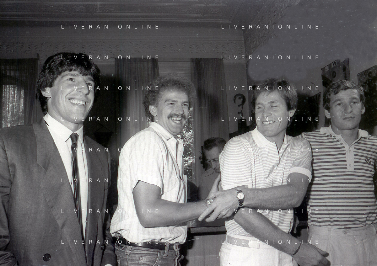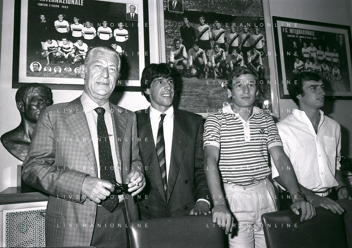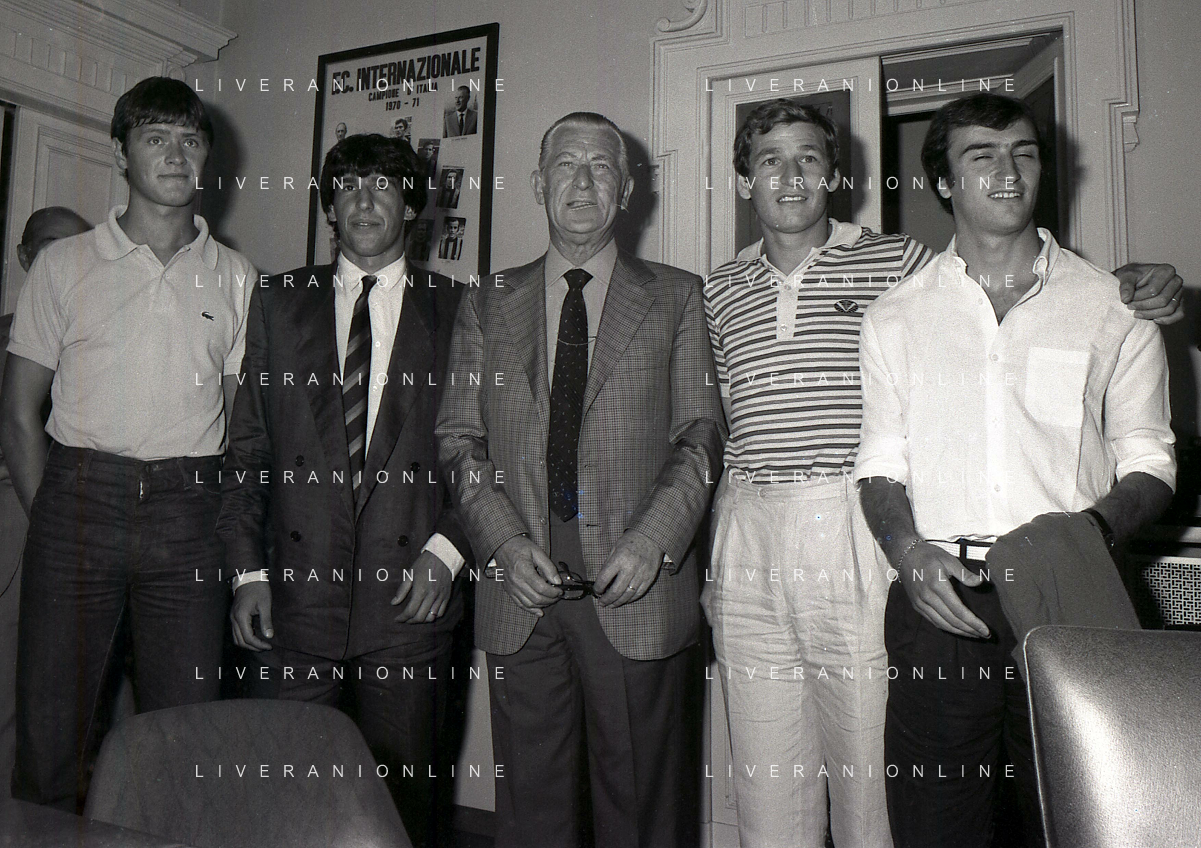 1981 MILANO RADUNO FC INTER IN SEDE PER IL RITIRO ESTIVO PRE CAMPIONATO NELLA FOTO da sin ALDO SERENA-SALVATORE BAGNI-IL PRESIDENTE IVANOE FRAIZZOLI-KLAUS BACHLECHNER E GIANCARLO CENTI AG ALDO LIVERANI SAS