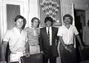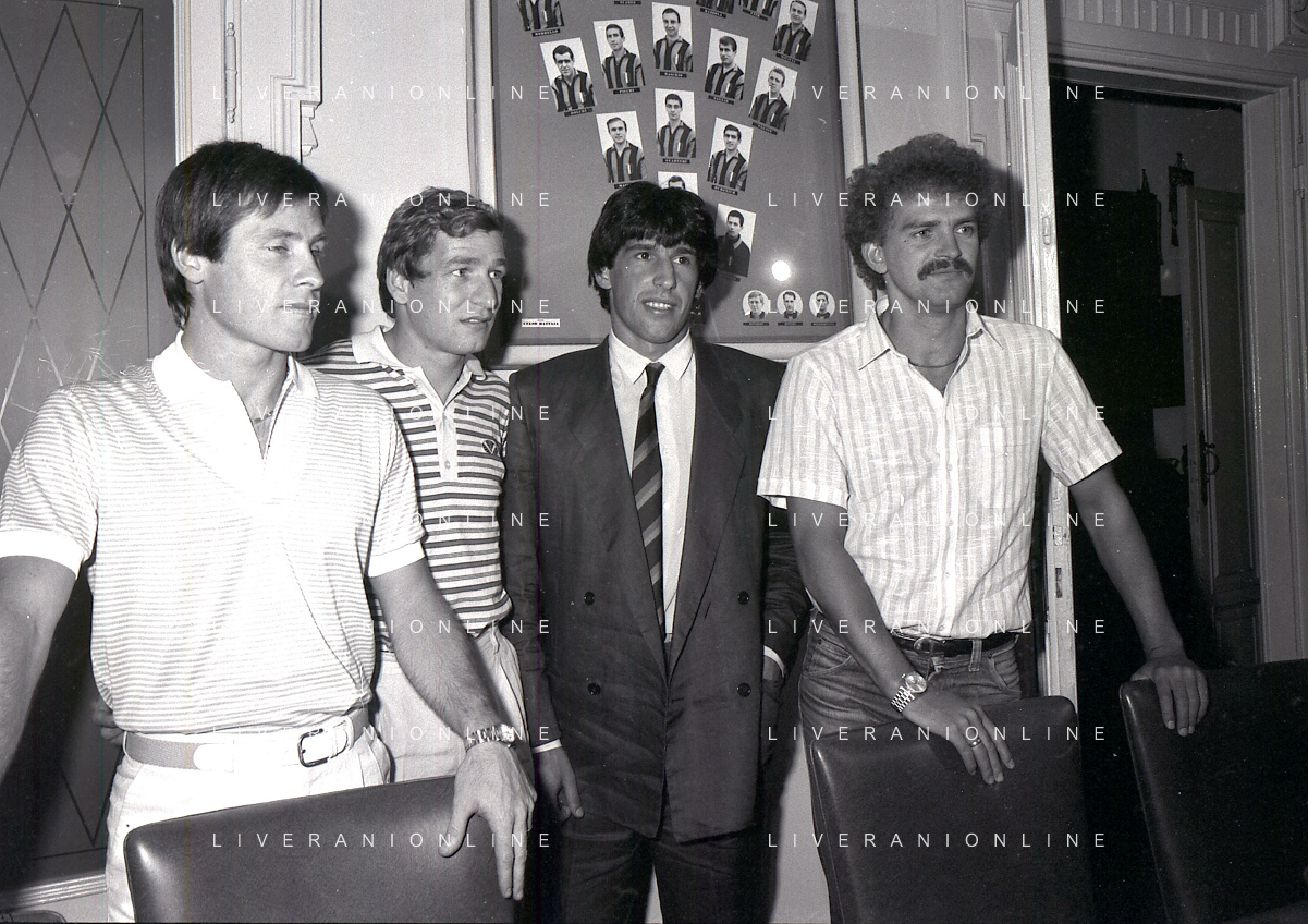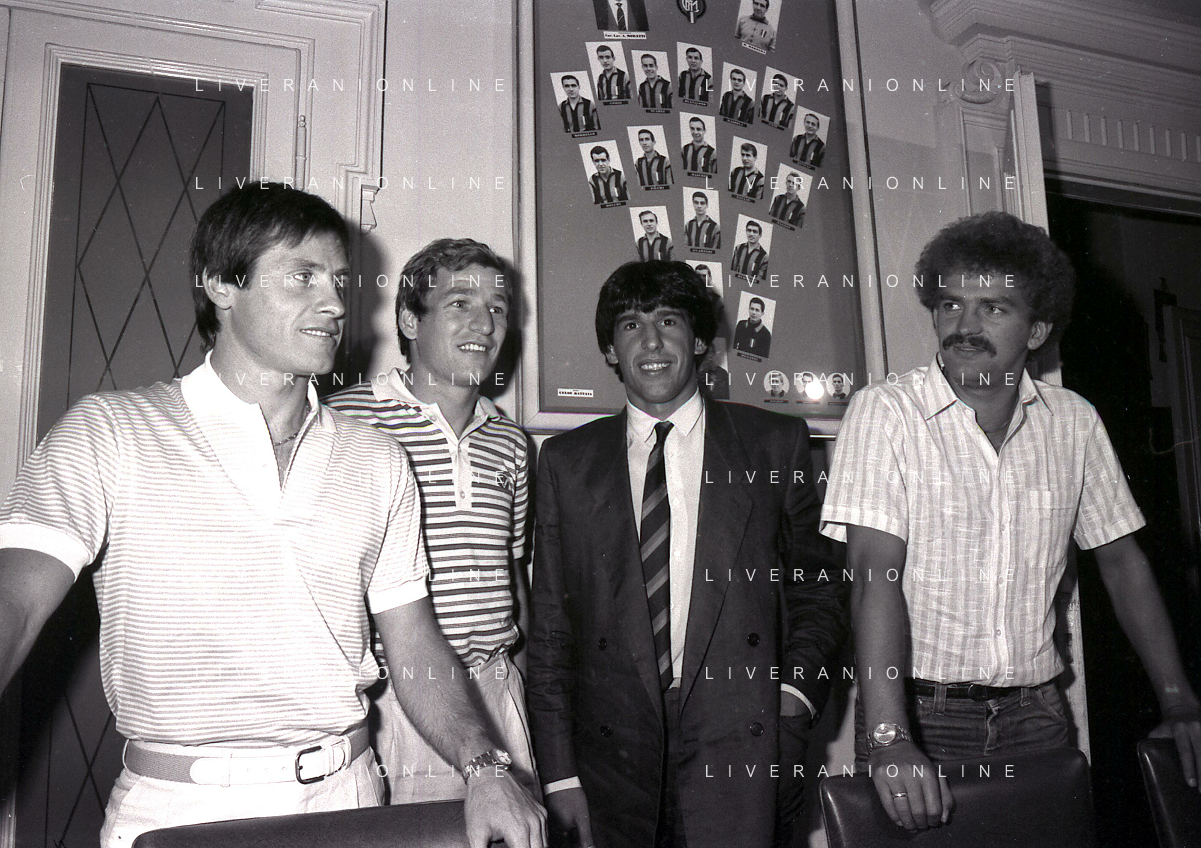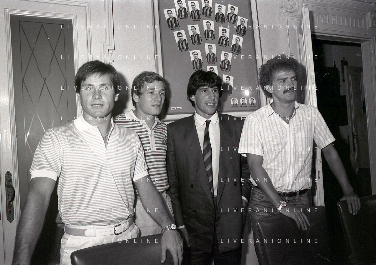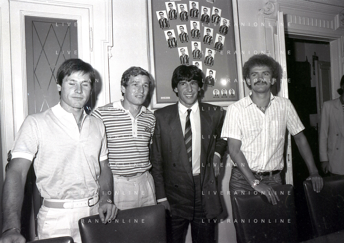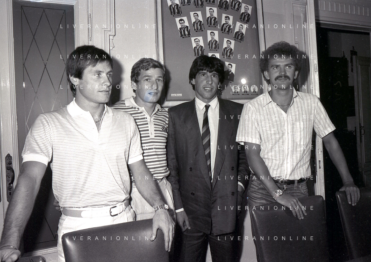1981 MILANO RADUNO FC INTER IN SEDE PER IL RITIRO ESTIVO PRE CAMPIONATO NELLA FOTO da sin SALVATORE BAGNI- HERBERT PROHASKA GABRIELE ORIALI-KLAUS BACHLECHNER AG ALDO LIVERANI SAS