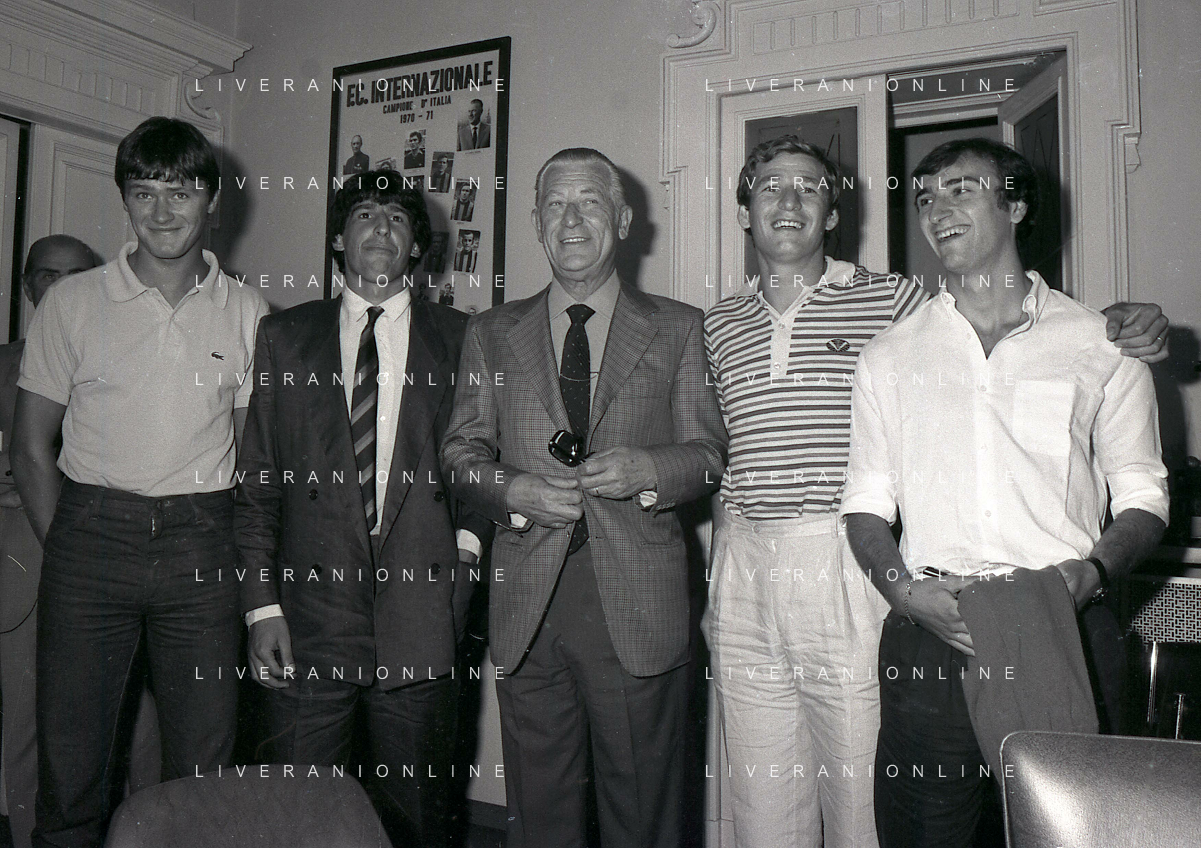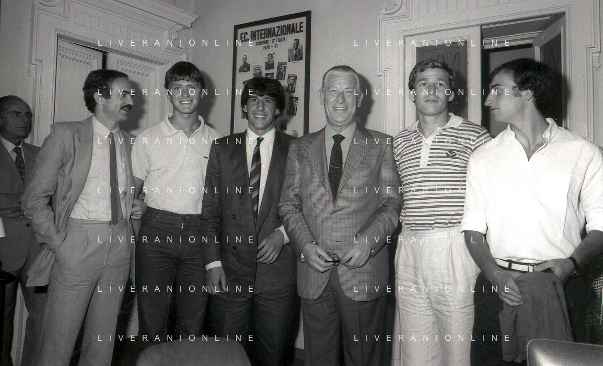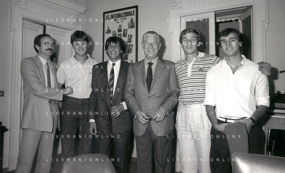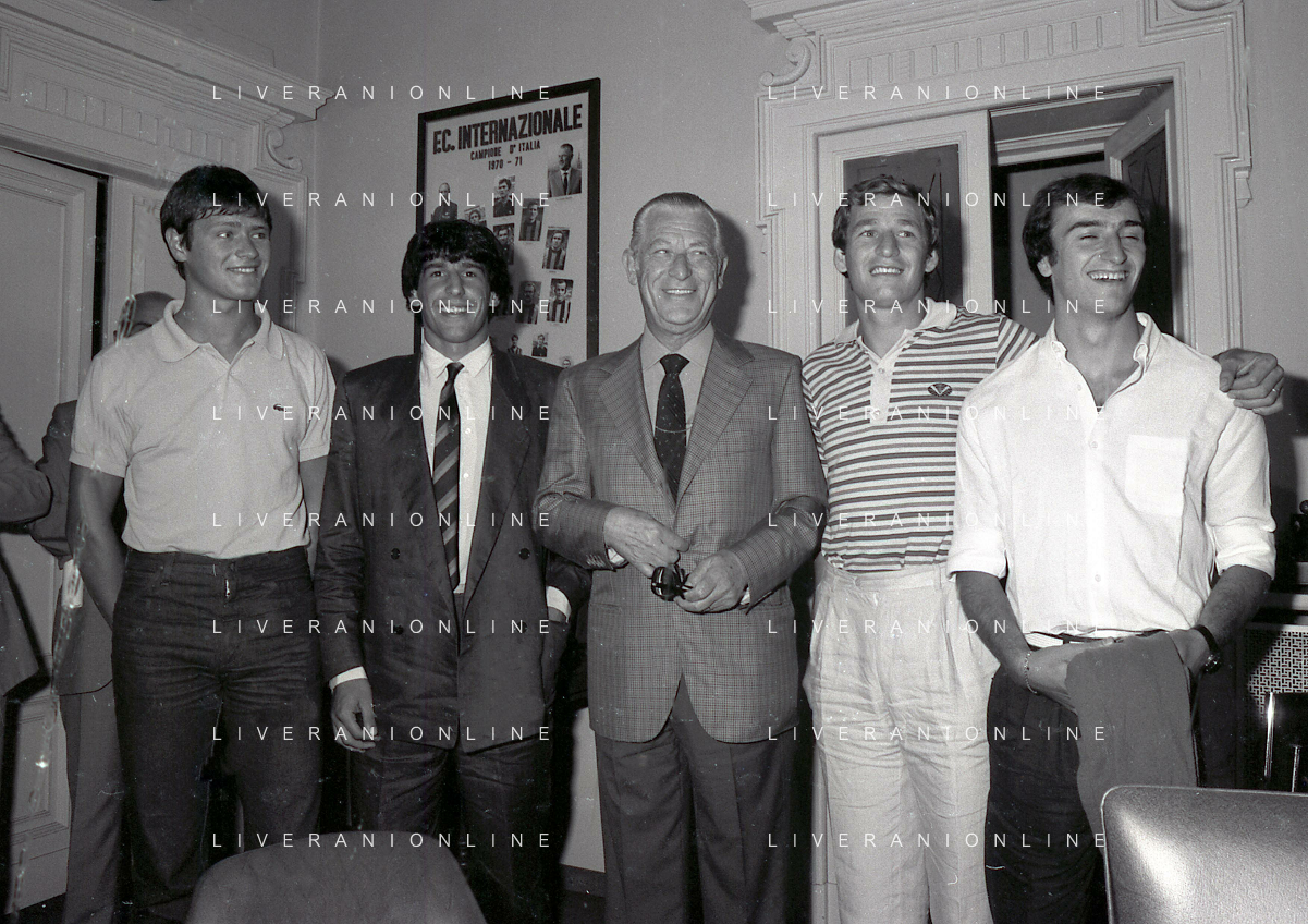 1981 MILANO RADUNO FC INTER IN SEDE PER IL RITIRO ESTIVO PRE CAMPIONATO NELLA FOTO da sin SANDRO MAZZOLA-ALDO SERENA-SALVATORE BAGNI-IL PRESIDENTE IVANOE FRAIZZOLI-KLAUS BACHLECHNER E GIANCARLO CENTI AG ALDO LIVERANI SAS
