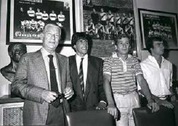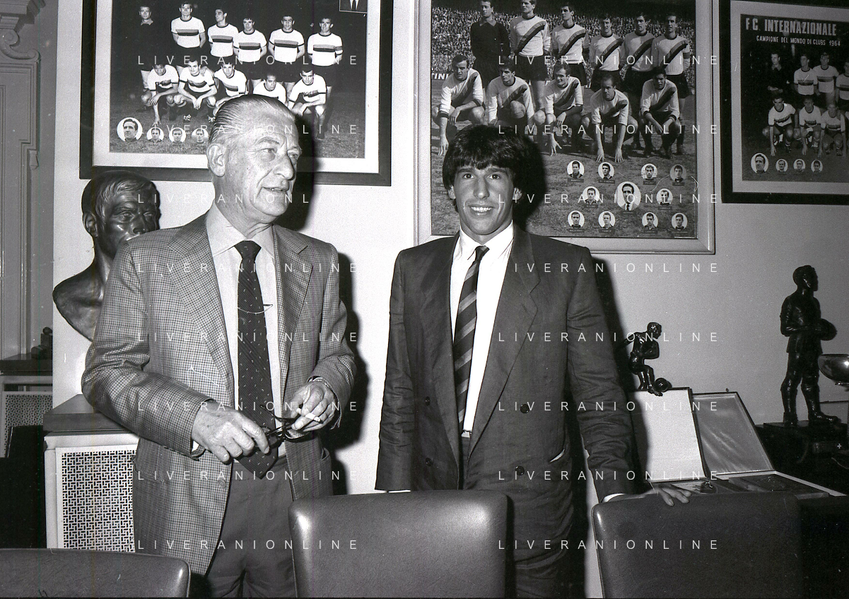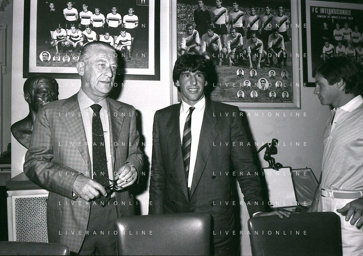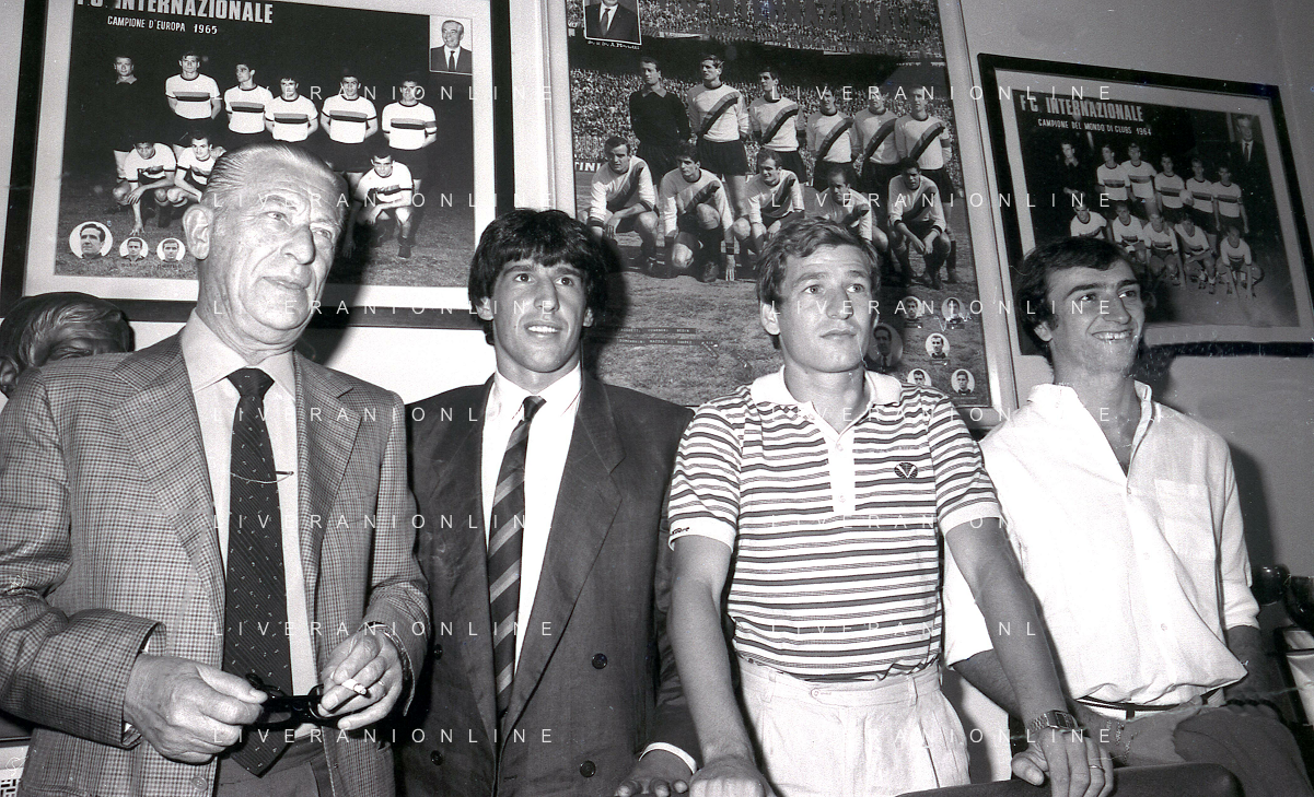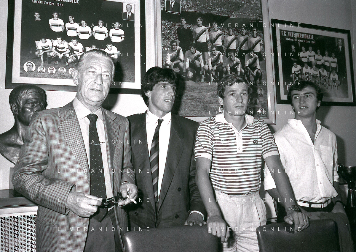1981 MILANO RADUNO FC INTER IN SEDE PER IL RITIRO ESTIVO PRE CAMPIONATO NELLA FOTO da sin SANDRO MAZZOLA-ALDO SERENA-SALVATORE BAGNI-IL PRESIDENTE IVANOE FRAIZZOLI-KLAUS BACHLECHNER E GIANCARLO CENTI AG ALDO LIVERANI SAS