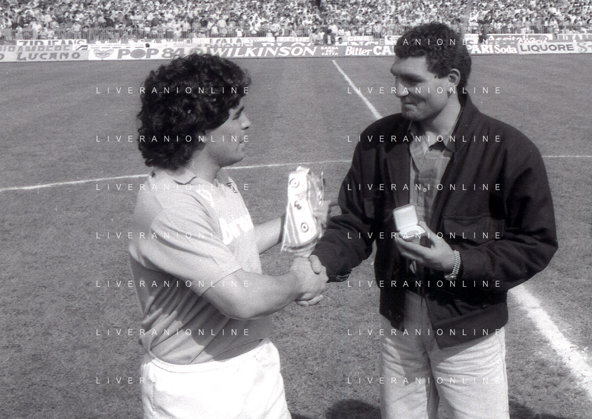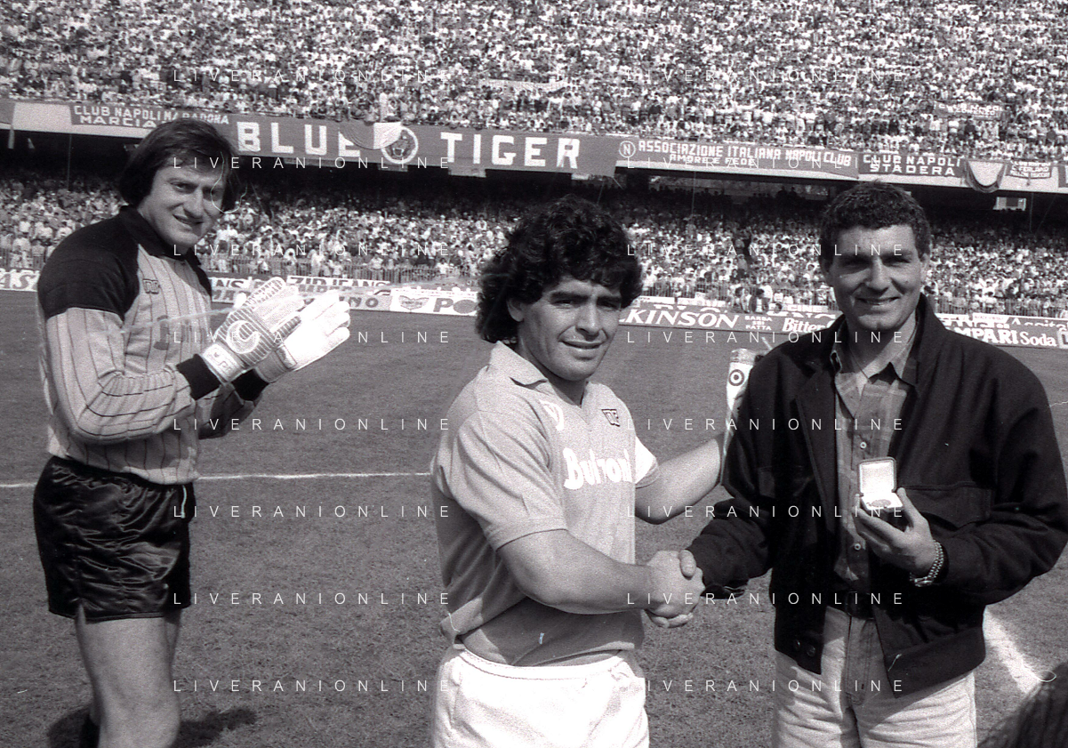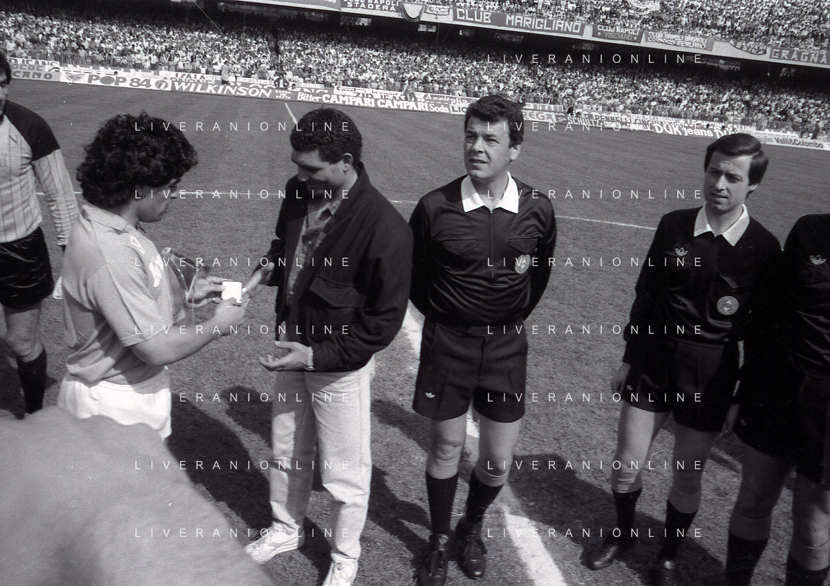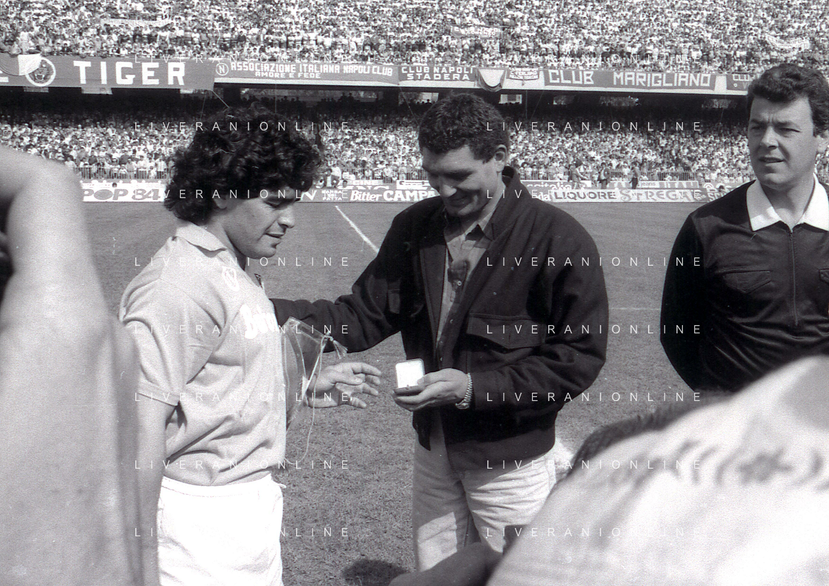 06-04-1986 NAPOLI-CAMPIONATO DI CALCIO SERIE A NAPOLI BARI 1-0 NELLA FOTO PATRIZIO OLIVA AL SAN PAOLO PER LA PREMIAZIONE A DIEGO MARADONA AG ALDO LIVERANI SAS
