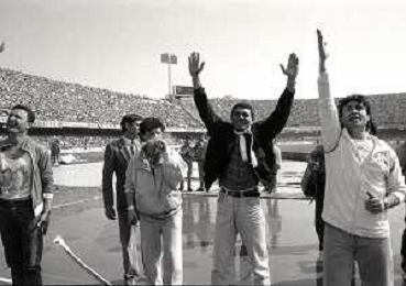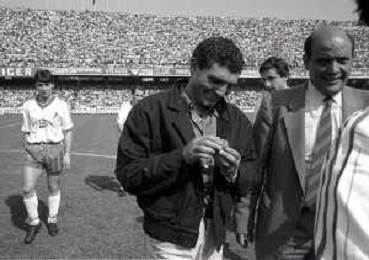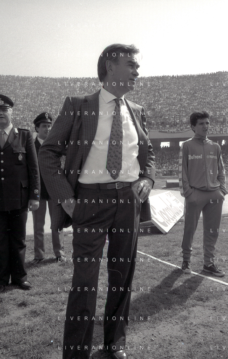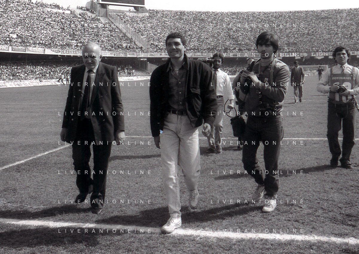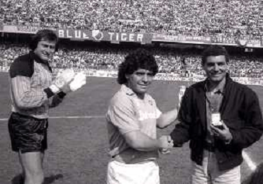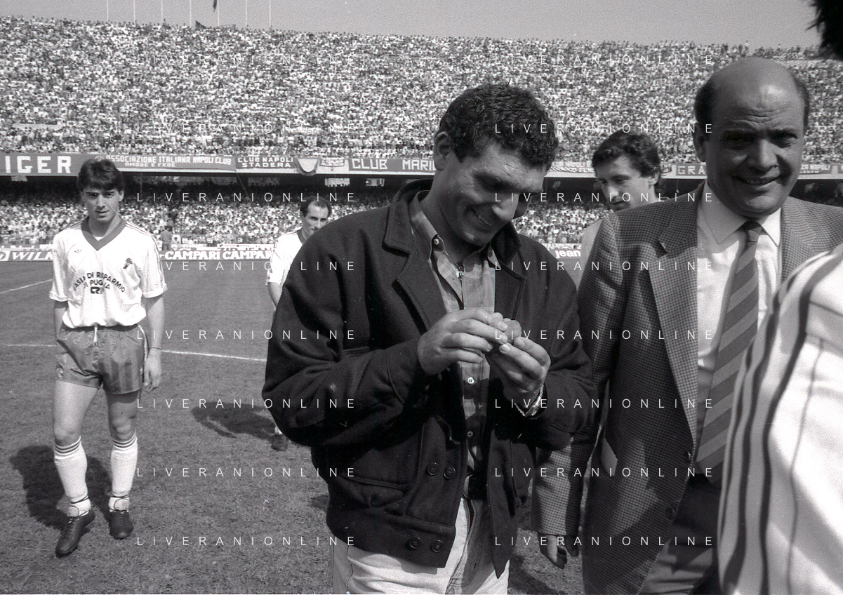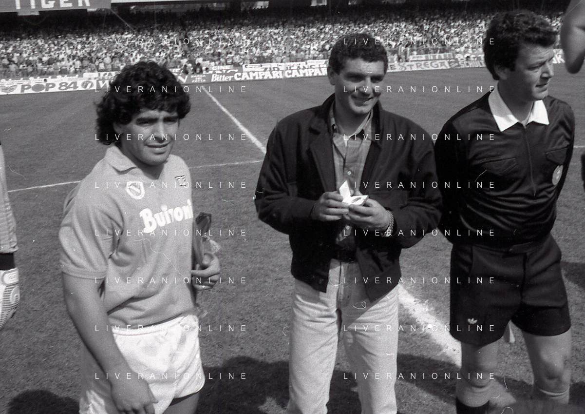 06-04-1986 NAPOLI-CAMPIONATO DI CALCIO SERIE A NAPOLI BARI 1-0 NELLA FOTO PATRIZIO OLIVA AL SAN PAOLO PER LA PREMIAZIONE A DIEGO MARADONA AG ALDO LIVERANI SAS