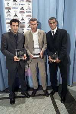 ROMA, 11/12/2000 FIFA WORLD PLAYER 2000 LUIS FIGO, ZINEDINE ZIDANE E RIVALDO CON I PREMI RICEVUTI aldo liverani s a s